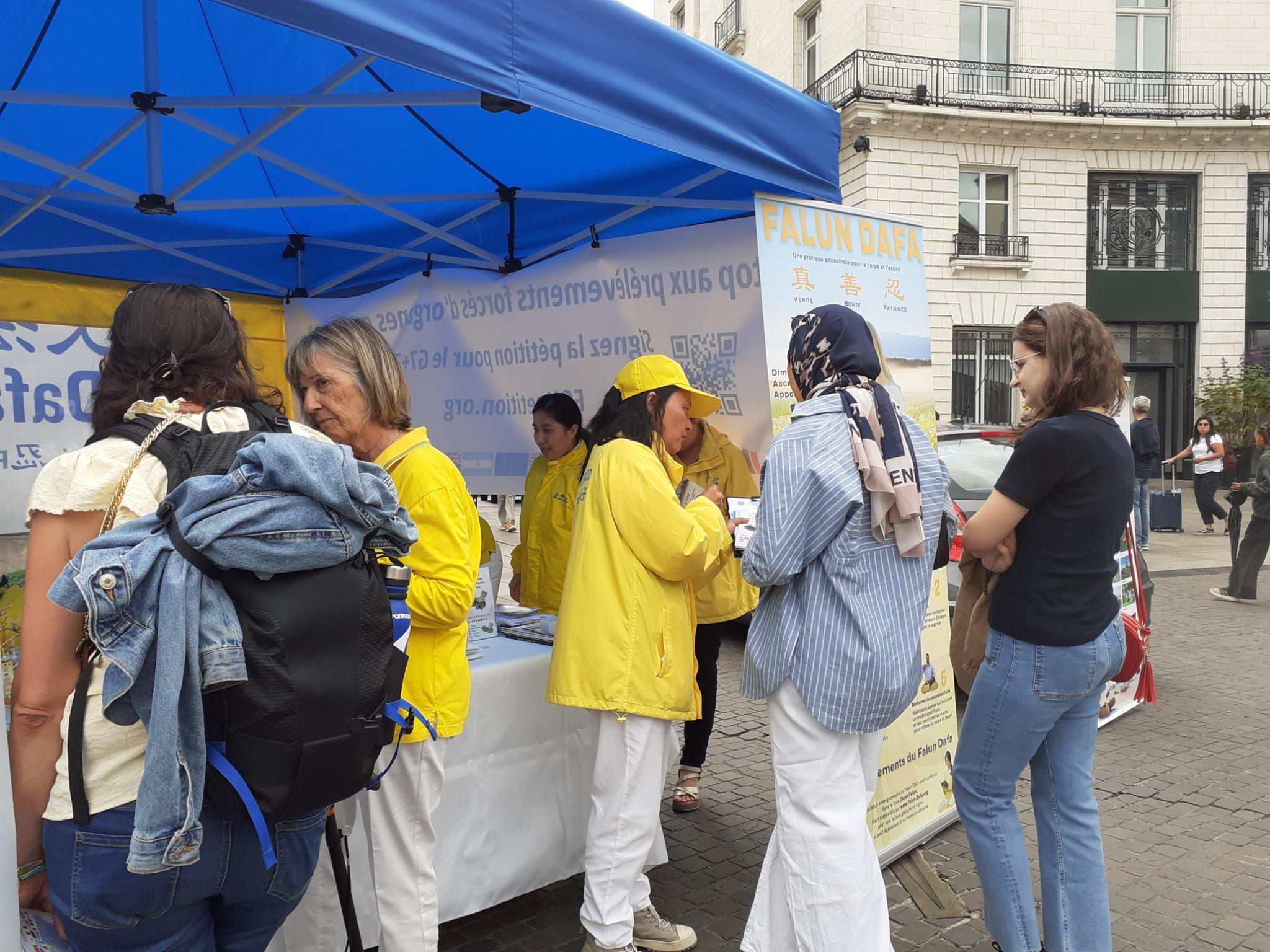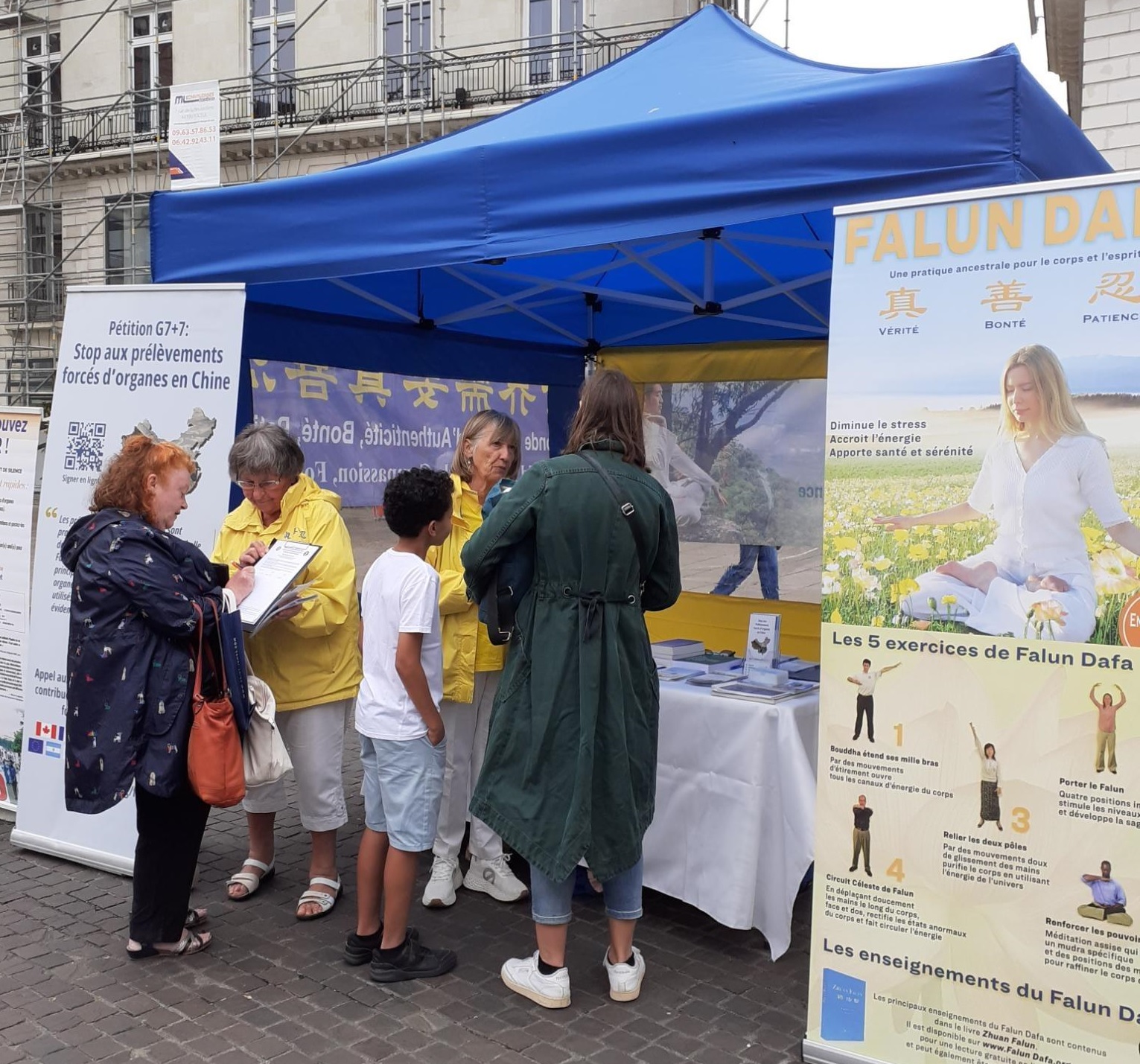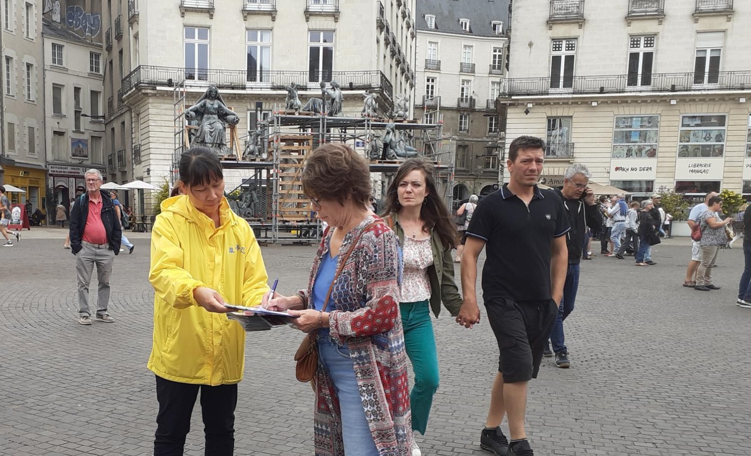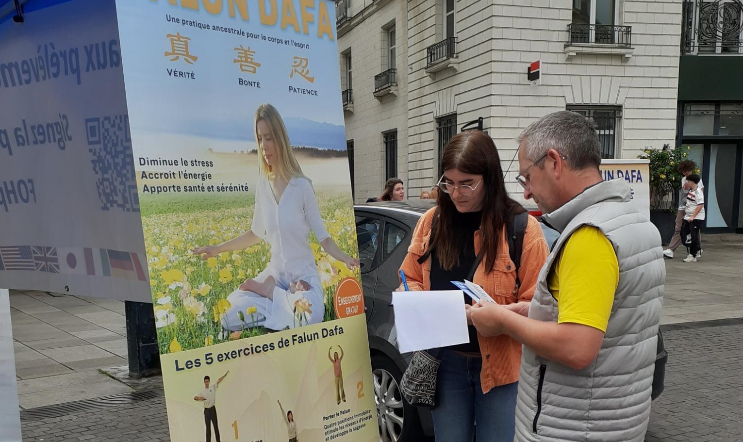 一位年輕女孩看到法輪功真相標語後,立刻打電話給她在尼斯的媽媽,告訴她在南特有一個法輪大法的展位。她簽署了請願書,並表示她的母親是位人權工作者,也支持法輪功的反迫害。於是,法輪功學員贈送她的母親法文版的《明慧報告:法輪功在中國大陸被迫害二十年》,這讓她非常感動。