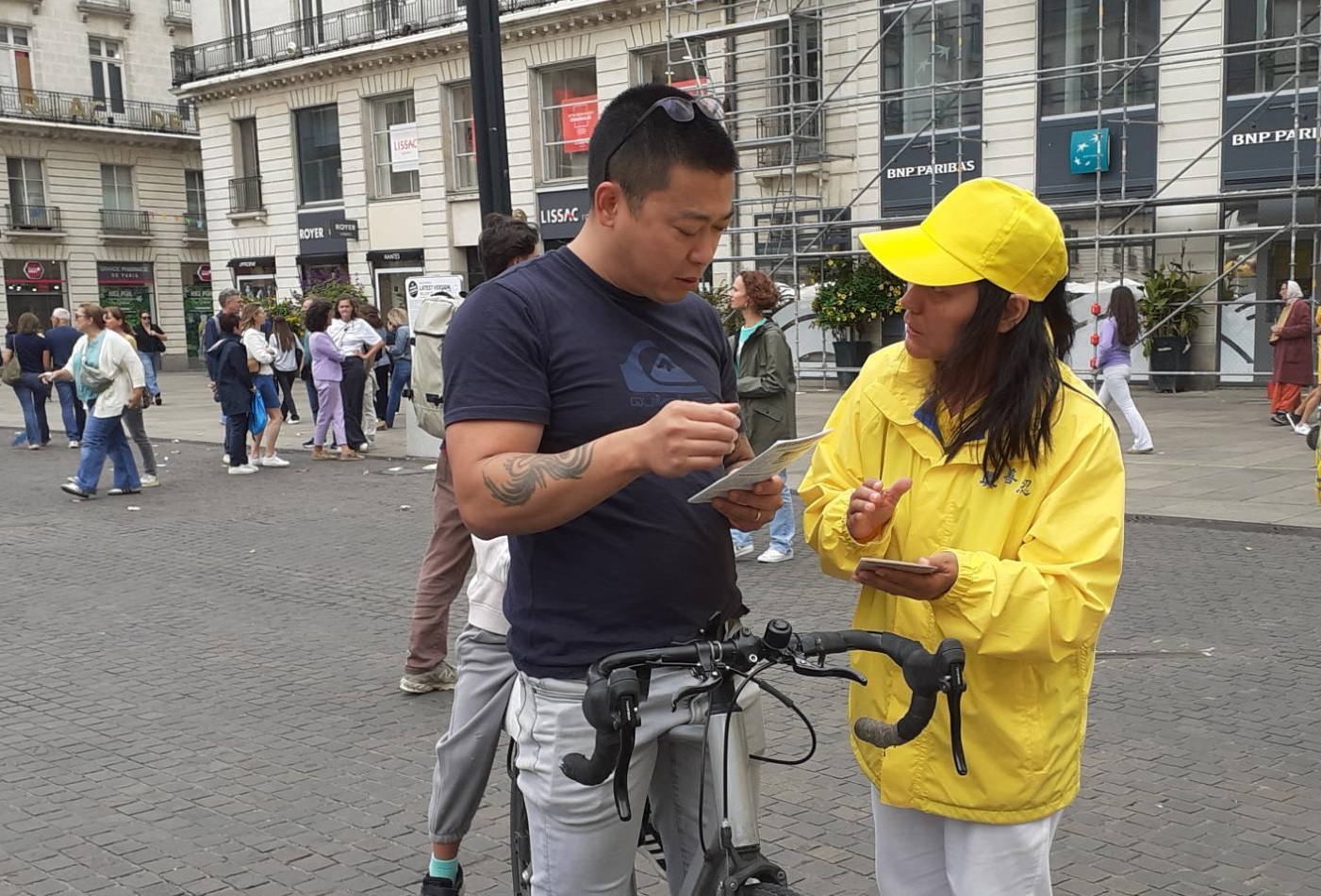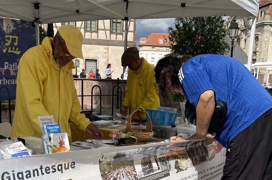 一位女士起初不想簽名,她表示在法國也有很多問題,中國又太遙遠,這與她無關。法輪功學員向她解釋了中國的情況,指出這是一種反人類罪。學員說道:「我們不是中國人,但我們修煉這個功法,知道法輪大法非常好,真善忍對每個人都有益。然而在中國,中共卻做著完全相反的事情,法輪大法的法輪功學員遭受迫害、酷刑,甚至被殺害以摘取器官,這就是為甚麼我們不能保持沉默。」在詳細解釋後,這位女士簽署了請願書,並對法輪功學員說:「你們做得很好,所做的事情非常美好,謝謝你們!」