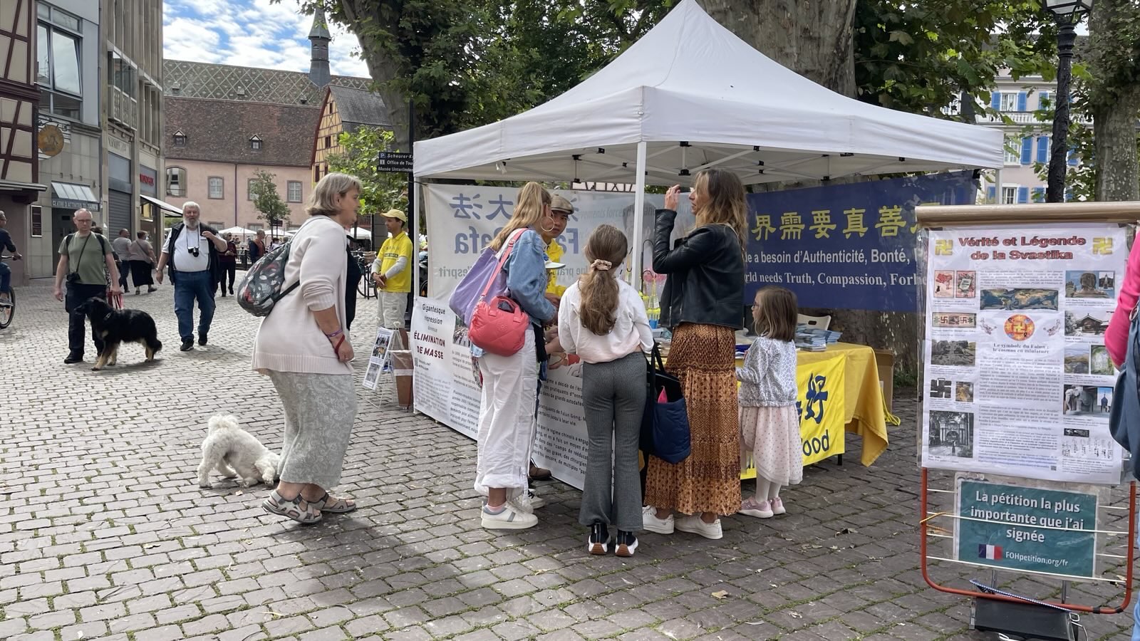 同日,在法國東部阿爾薩斯地區科爾馬(Colmar)的拉辛河岸(Quai de la Sinn),法輪功學員進行了法輪功功法演示、講真相和徵簽的活動。