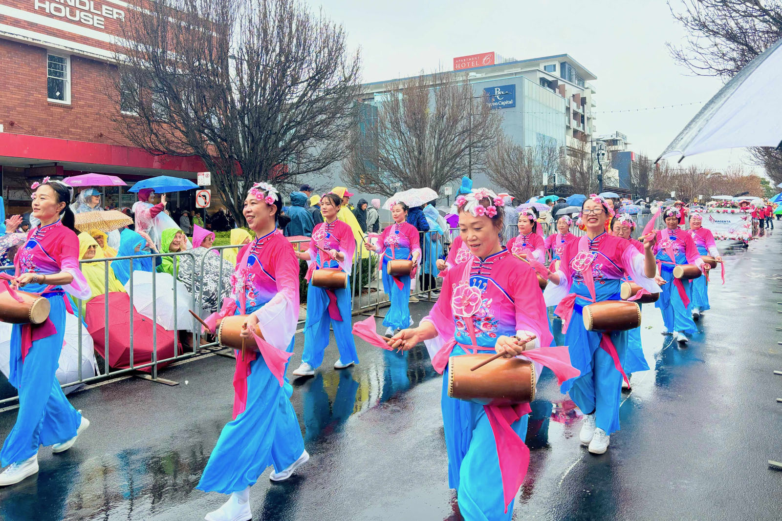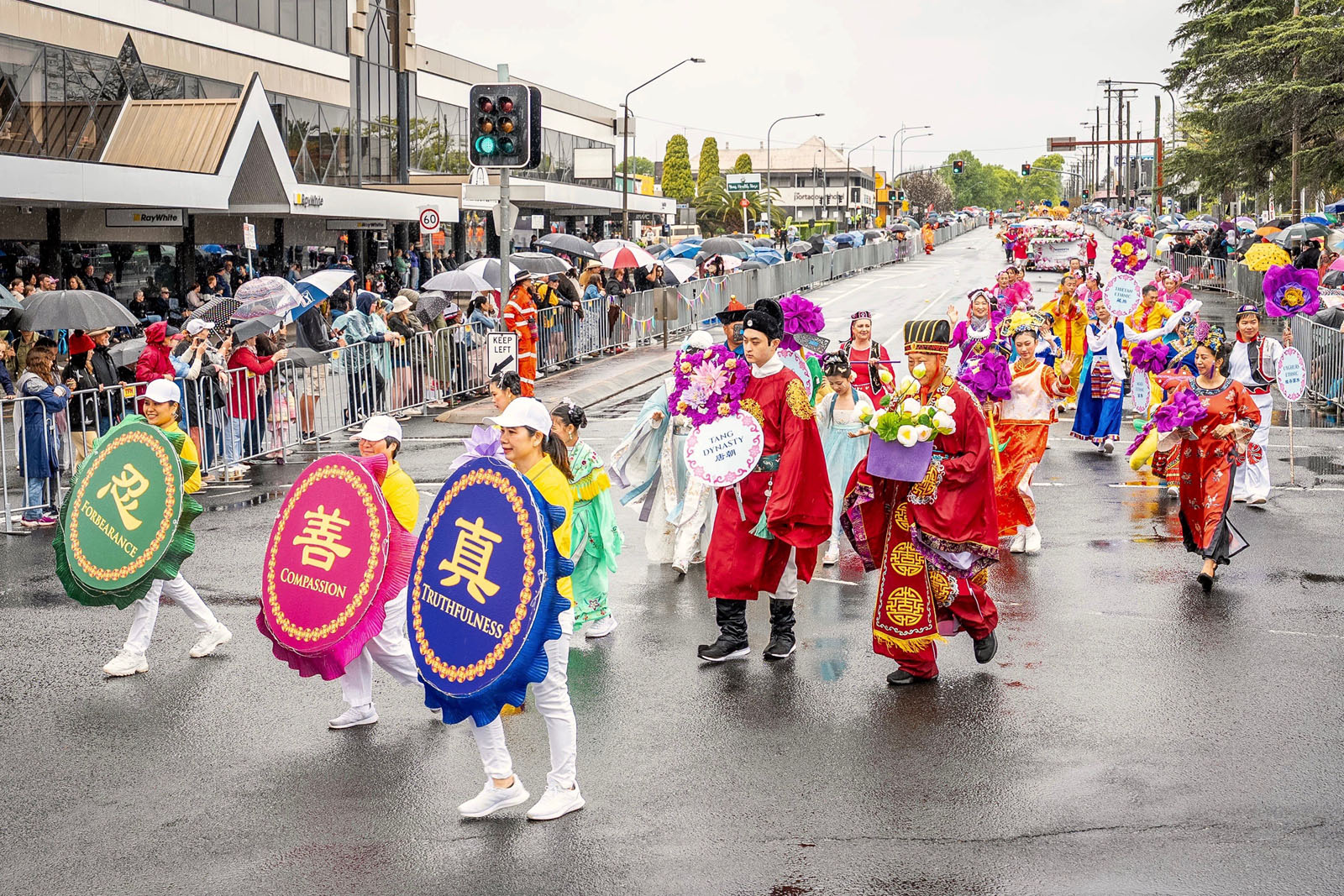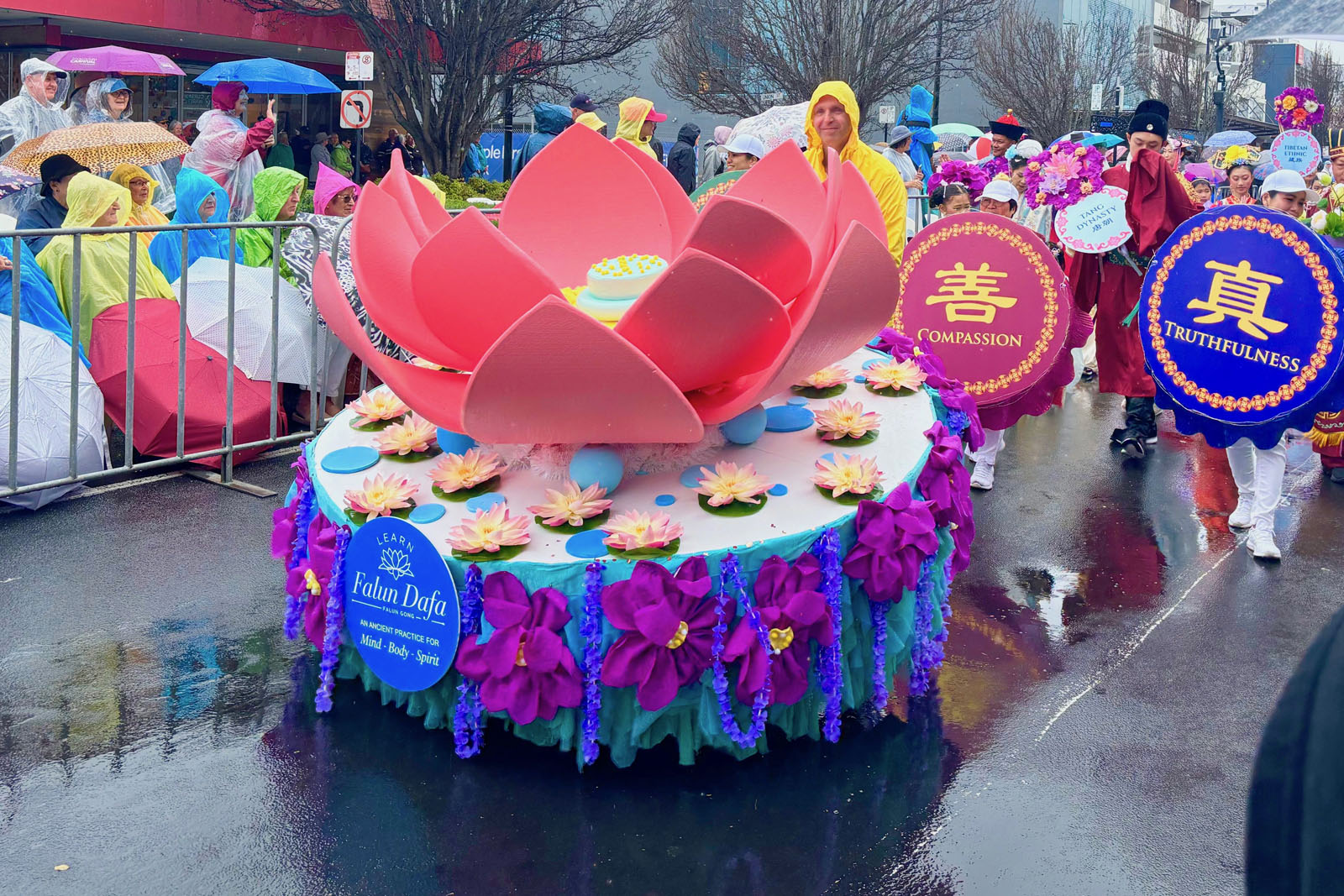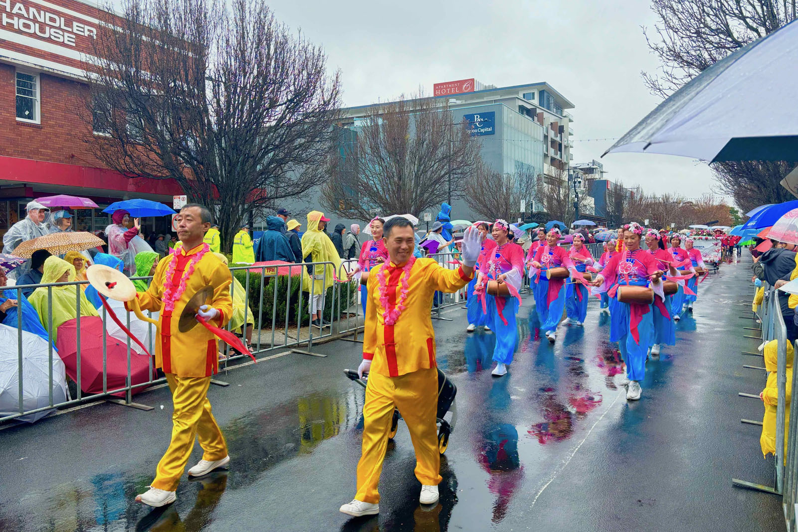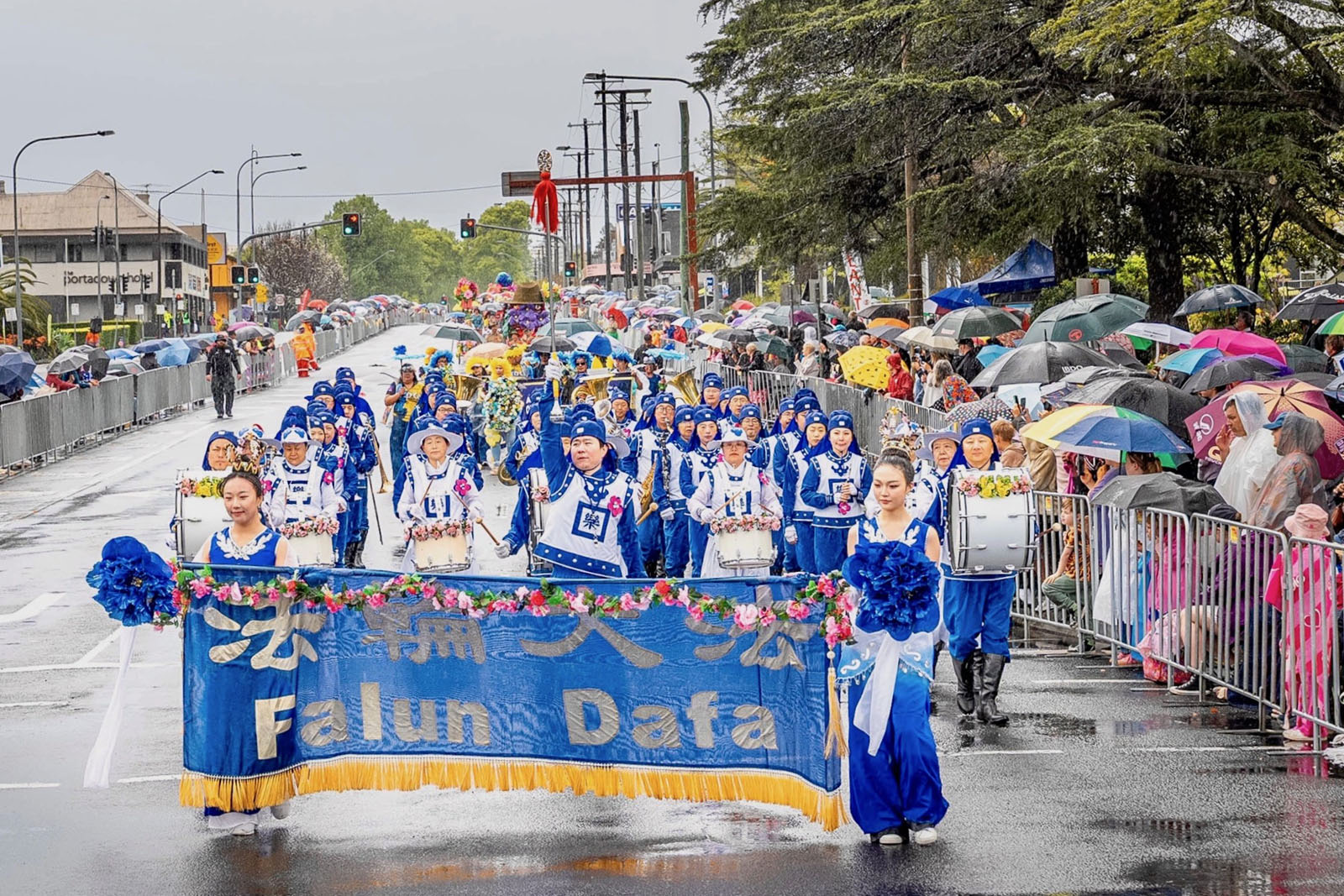 「現在登場的是澳洲法輪大法協會昆士蘭分會。(我們)非常榮幸他們能參與中央花車遊行,自一九九九年起至今(他們)持續參與遊行。法輪功是一種修煉方法,全球數百萬人遵循真、善、忍的原理修煉。法輪功包含五套功法,易於學習。現已弘傳全球一百多個國家,幫助無數人改善健康、減輕壓力並獲得心身健康。」