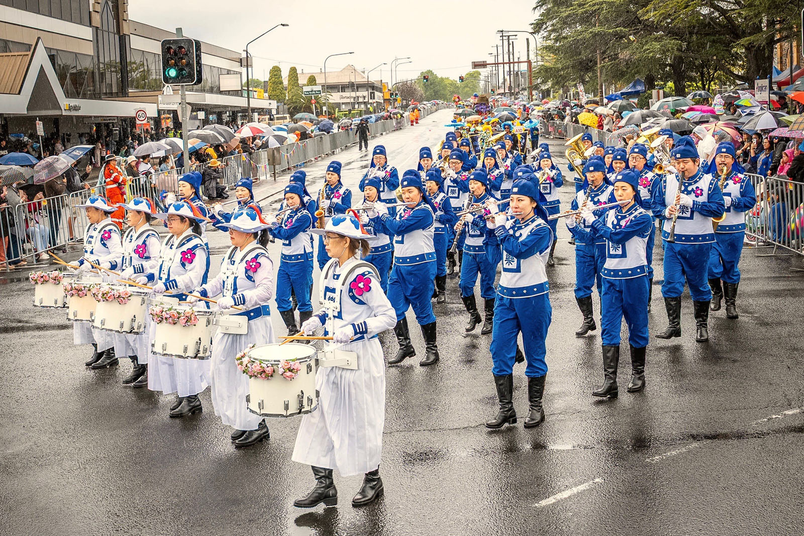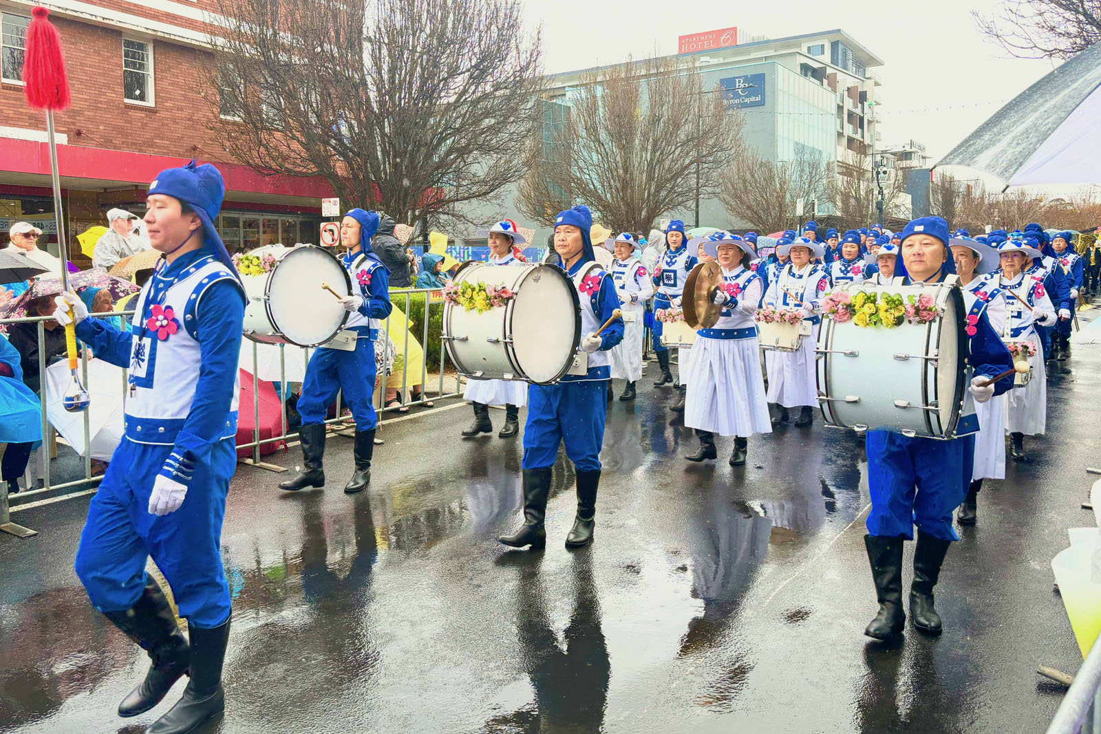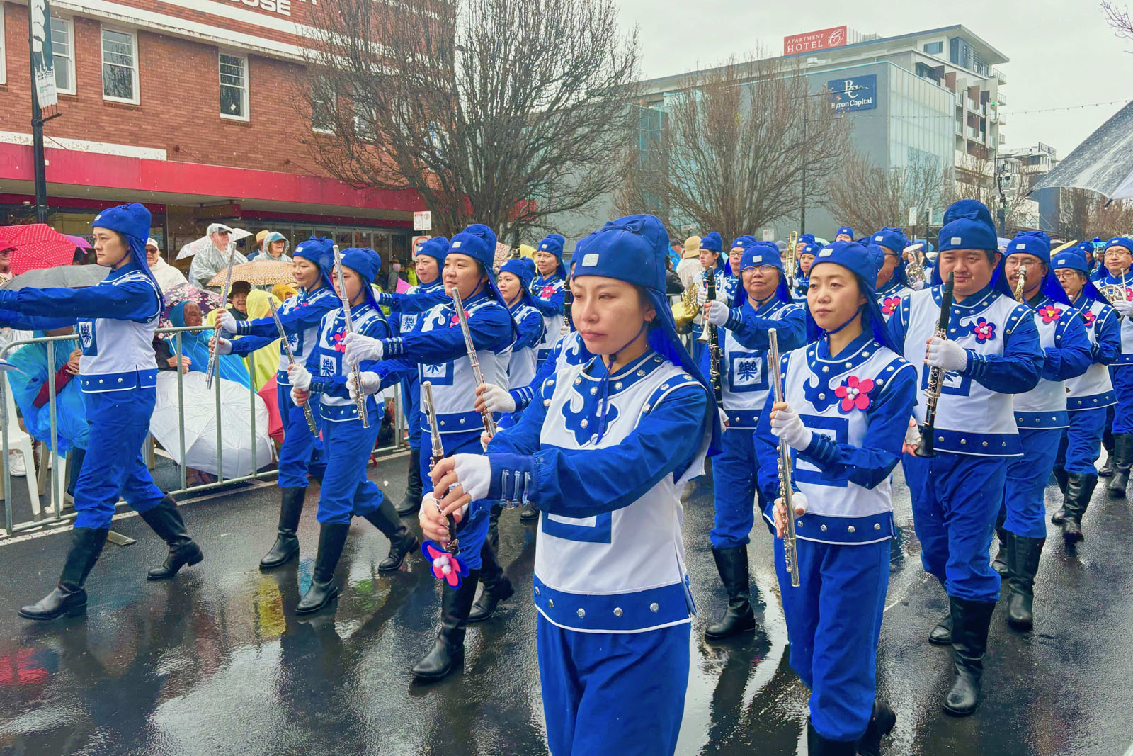 法輪功學員的方陣以超凡脫俗的光彩與祥和贏得了沿途數以萬計民眾的歡迎。沿途設有九個高音喇叭講解台,昆士蘭ABC新聞主持人珍妮﹒伍德沃德(Jenny Woodward)向觀眾介紹:「接下來我們將看到法輪功社區的表演,這是他們的天國樂團──一支由修煉法輪功的音樂家組成的銅管木管樂隊。」