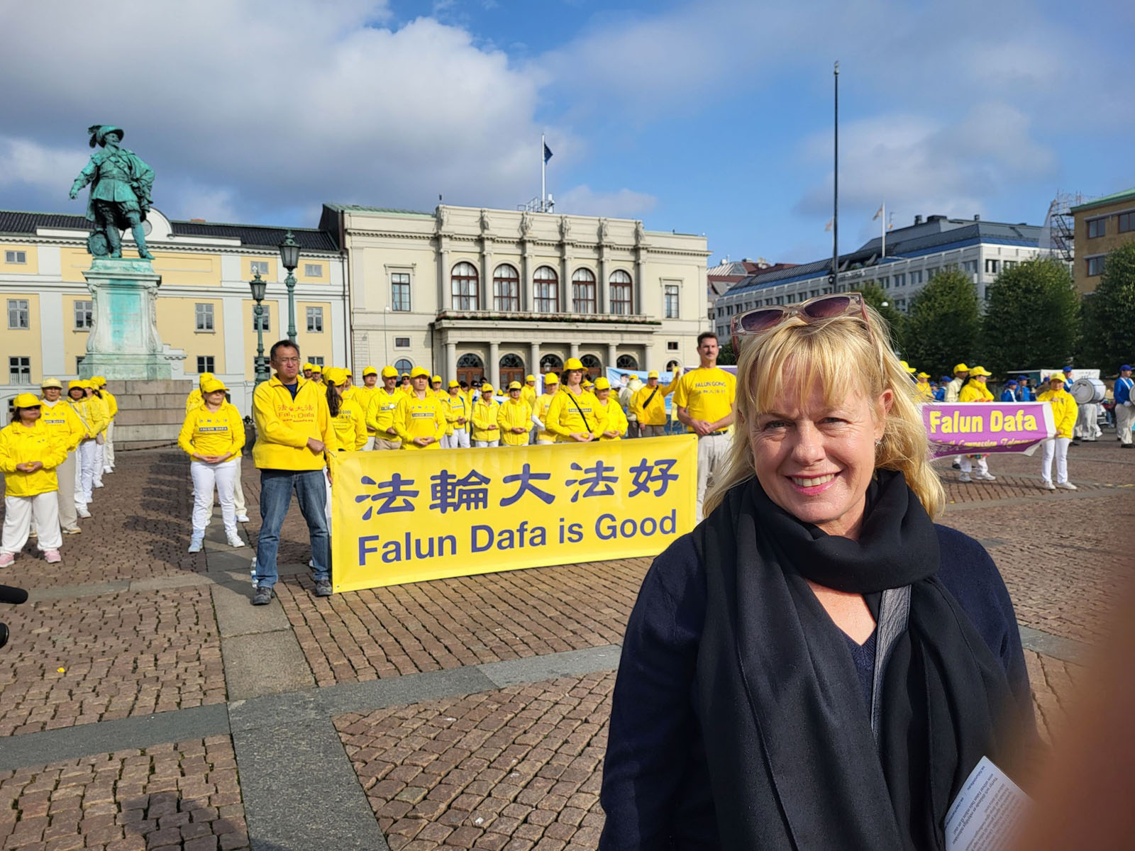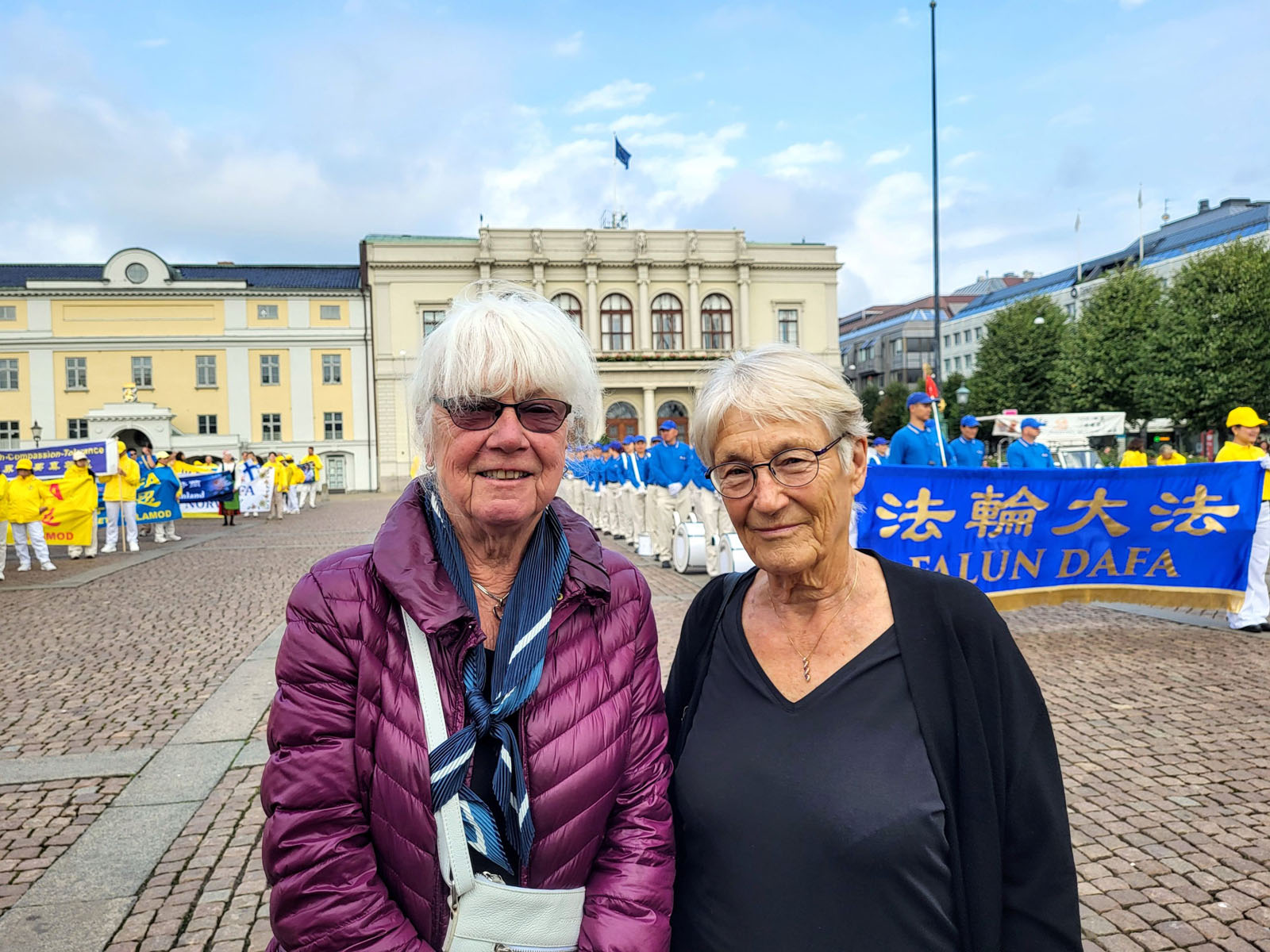 在活動現場,居住在歌德堡的八十歲的洛塔(Lotta)女士和七十六歲的克里斯特爾( Kristel)女士一起觀看天國樂團演奏,並喜形於色地交談著。克里斯特爾表示自己開始了解法輪功已經二、三年了,並且通讀《轉法輪》兩遍和堅持煉功。克里斯特爾表示:修煉法輪功讓她保持健康,雖然書的內容很多,但值得反覆閱讀。