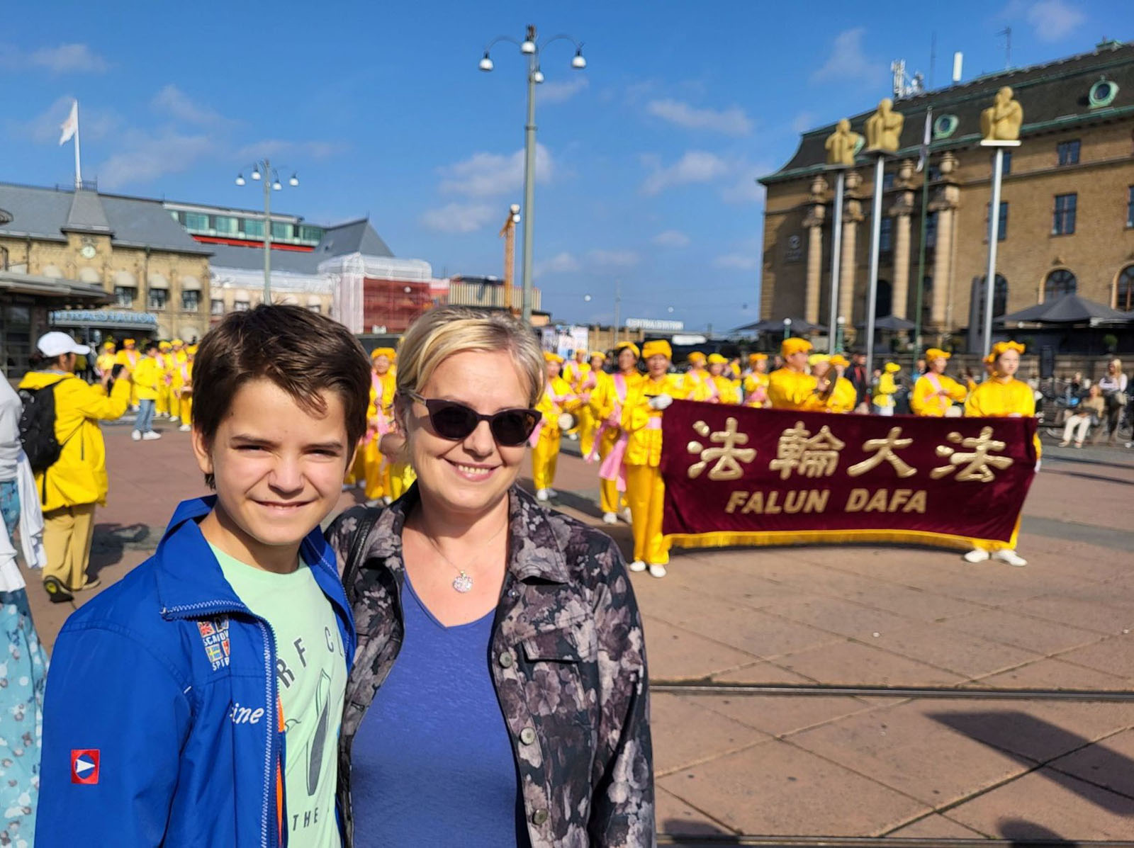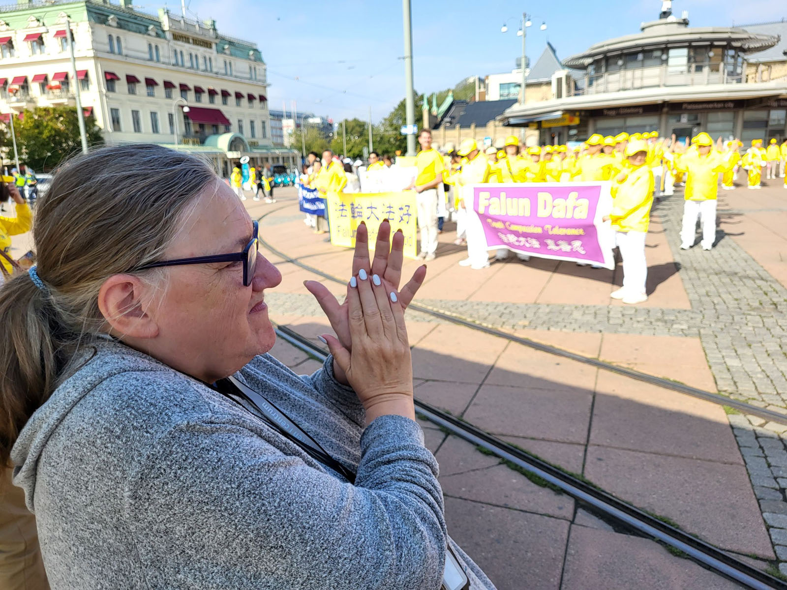 克里斯蒂娜﹒特蘭伯格(Kristina Tranberg)推著助行車,雖然行動不便,但是她一直在附近沒有離開,直到遊行隊伍又返回到原點。克里斯蒂娜激動地分享道:「我原本只是路過,但聽到這音樂後,整個人都暖和了起來。這是我第一次聽到這種旋律,感覺像是心靈被觸動了。」她一邊擦拭眼角的淚水,她說曾在電視上聽說過這類表演,但親眼所見到的法輪功隊伍,卻是完全不同的震撼:「這種場面太真實了,太感人了。我覺得這些音樂不只是表演,它們傳遞的是一種原理真、善、忍。」