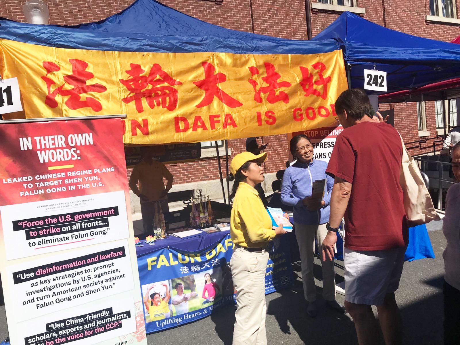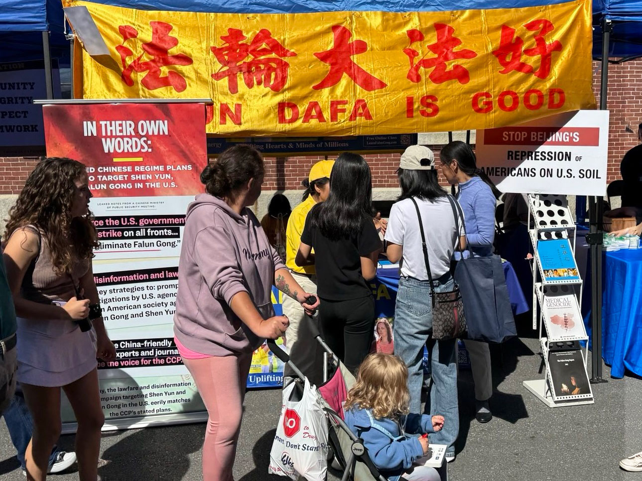 法輪功攤位獨樹一幟,有各類圖片展板述說著修煉大法帶給世界的美好,帶給人們身體的健康和道德的昇華,並告訴民眾中共迫害法輪功的邪惡,提醒大家「中共跨國鎮壓的觸角就在你的身邊,已經伸到美國及世界各地」。有民眾表示,在紛亂與迷茫的世局中,法輪大法就像是一個「指路燈」。