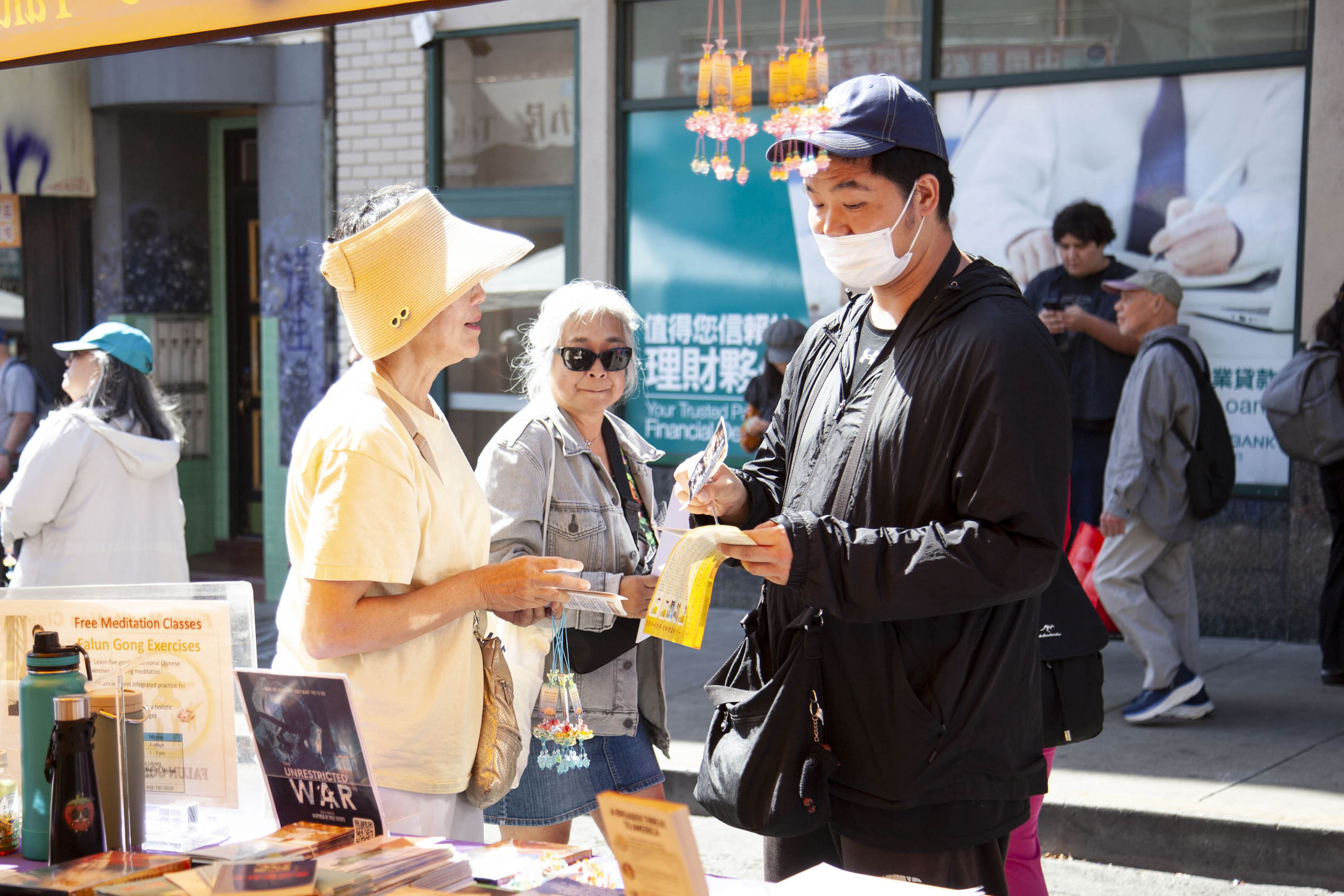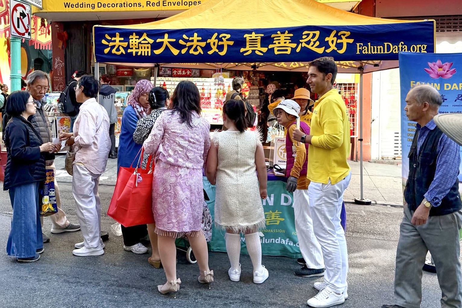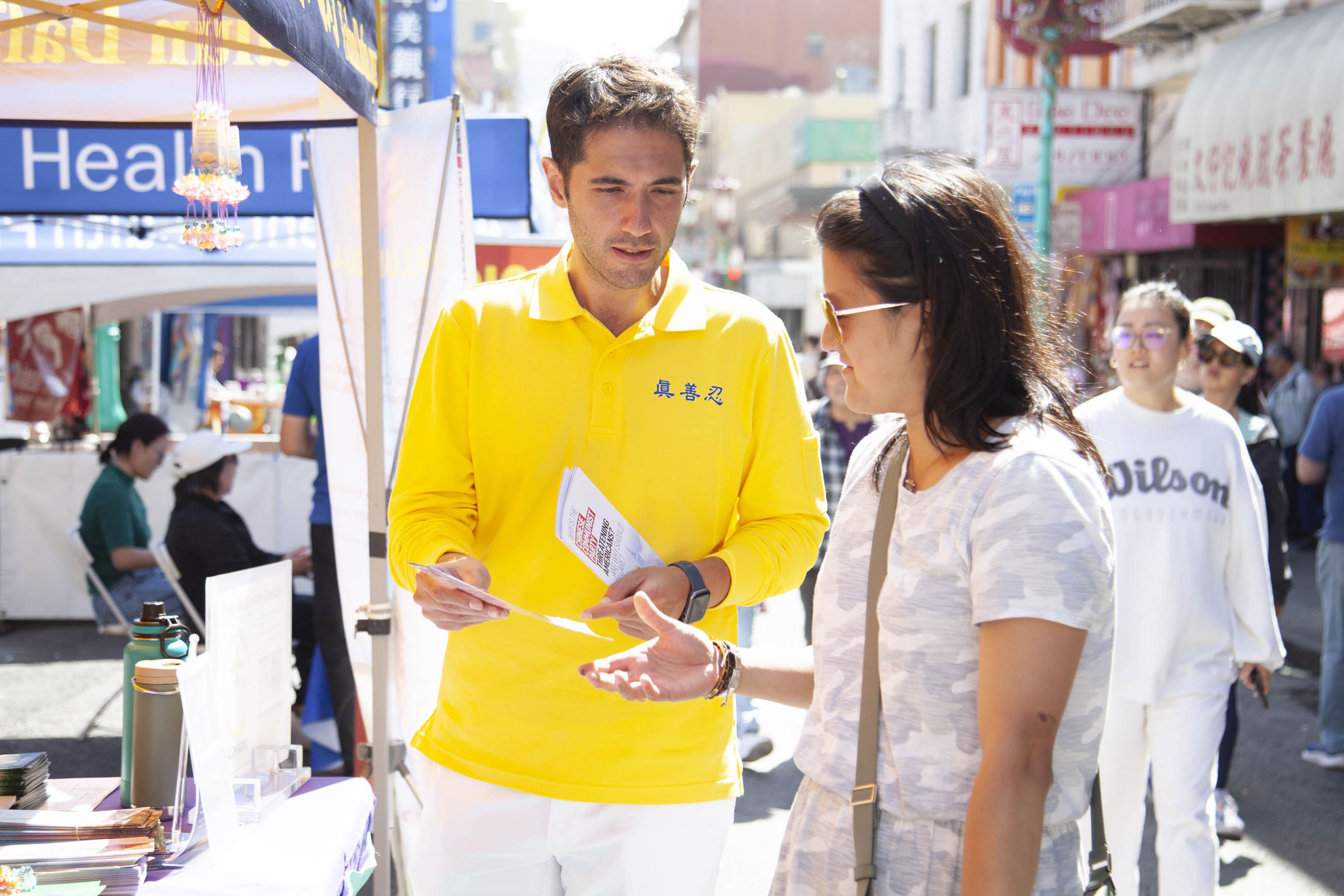 在法輪功展位講真相的伊朗裔美國人納維德﹒瓦納希(Navid Vanahi)參加了二十七日上午在帕西菲卡市(Pacifica)的遊行後,又前往舊金山中國城法輪功展位講真相。
