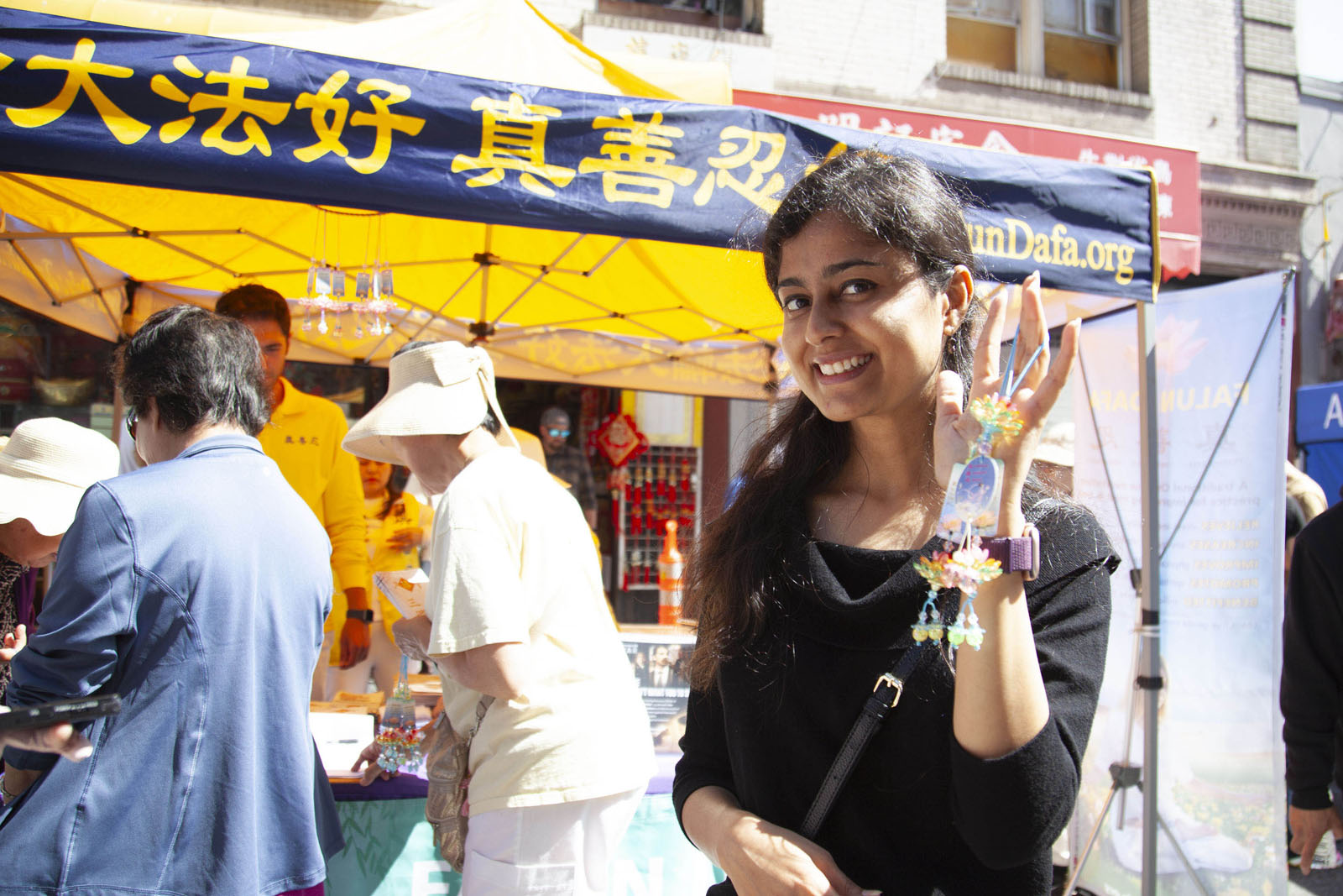 舊金山居民安基塔(Ankita)與丈夫了解法輪功後,對法輪功很感興趣,並在現場學煉。安基塔說,「這個功法很好,煉法輪功能讓我平靜下來,我感到身體變得輕鬆,不僅是外在的身體,內心也感到輕鬆,放鬆的感覺真好。」