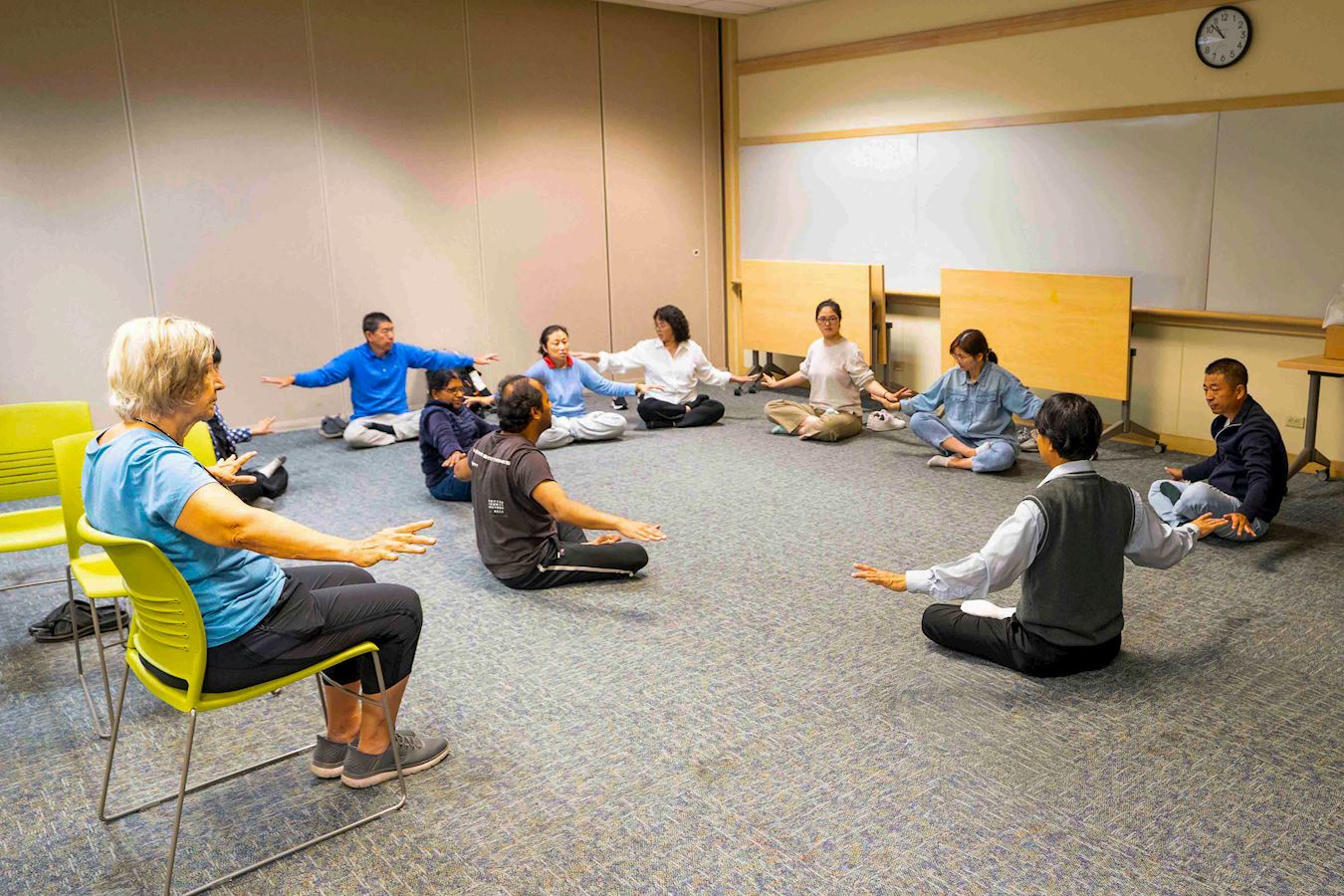 西人新學員瑪麗(Mary)表示,她的腿受傷了,因此很難像其他學員那樣打坐。談到法輪功教功班,她說,「對我來說,這個教功班很有趣。這個功法很好,對我很有用,我會去公園參加集體煉功。」
