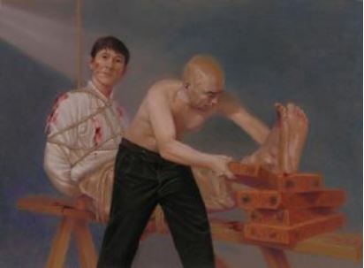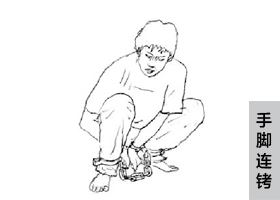 ![]() 中共酷刑演示:暴力灌食 | ![]() 中共酷刑示意圖:手腳連銬 |
