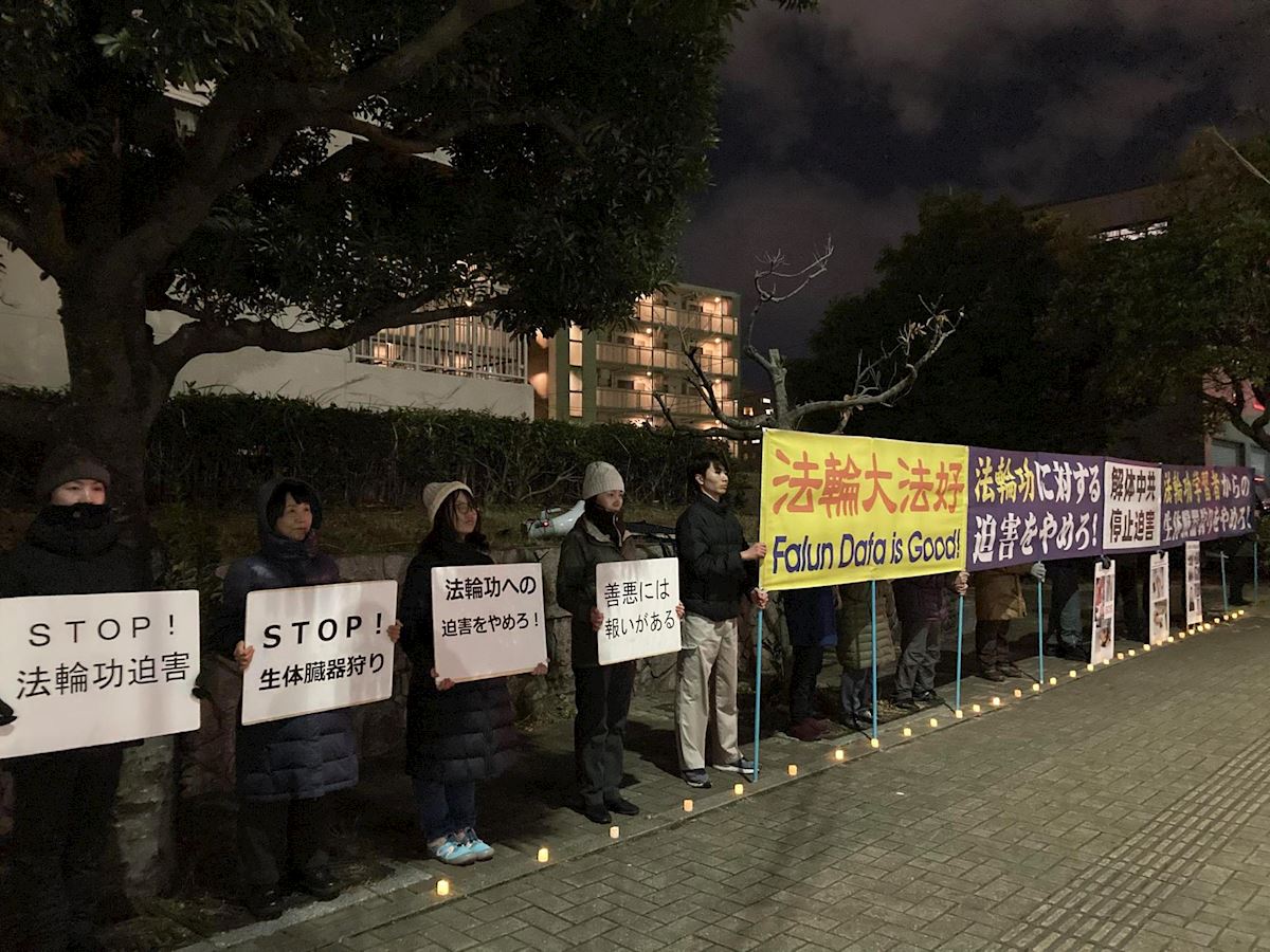 學員們整齊地展示多條中日文橫幅與真相展板,上面寫有「法輪大法好」「立即停止對法輪功的迫害」「立即停止對法輪功學員的活摘器官」「還法輪功自由」「STOP!對法輪功的迫害」「善惡必報」「STOP!活摘器官」等醒目標語,強烈譴責中共對法輪功迫害。