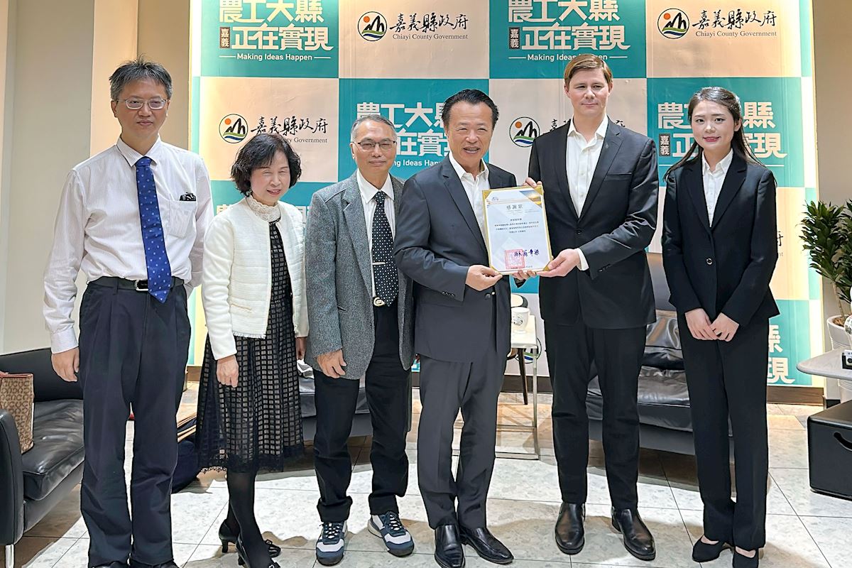 ![]() 圖4:嘉義縣長翁章梁(右三)一月二十日代表縣府頒發感謝狀,感謝神韻為南台灣觀眾帶來世界級藝術饗宴,並讚揚神韻長年以藝術傳遞深刻的精神價值;由神韻新紀元藝術團主持人唐韻(右二)、舒雅(右一)代表藝術團接受褒獎。 |