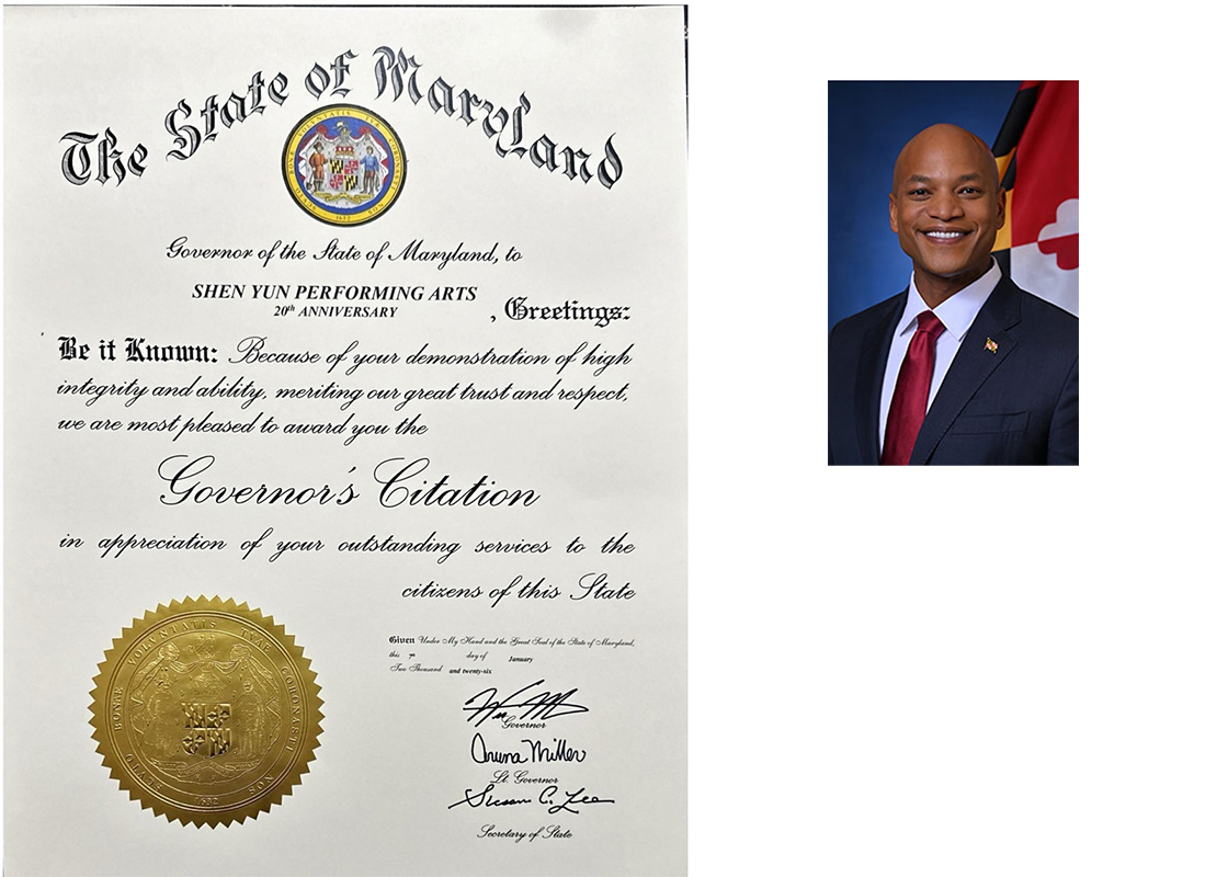 馬裏蘭州州長韋斯﹒摩爾,副州長阿魯娜﹒米勒(Aruna Miller)及州務卿蘇珊﹒李(Susan C. Lee)感謝神韻藝術團對馬裏蘭州公民作出的傑出服務,他們在褒獎令中寫道:「你們展現出高度誠信與才能,贏得我們極大的信任和尊重」。