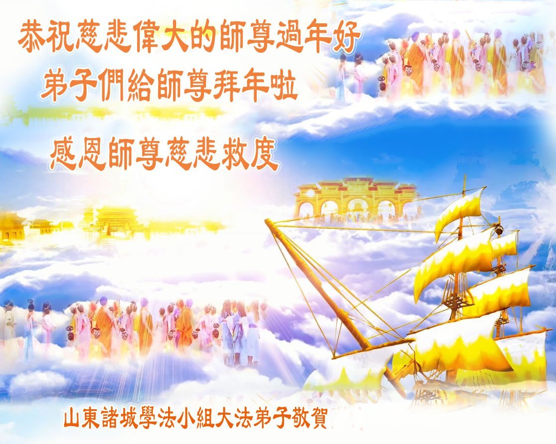 恭祝慈悲偉大的師尊新年快樂!感恩大法造就無量無際的新洪宇蒼穹!這感恩化作無窮的能量與法力,使弟子同化大法做好三件事。在助師救度眾生的路上,越來越智慧、理智、成熟,修成無私無我先他後我的正覺,完成神聖使命,滿載眾生隨創世主返回新宇洪穹!感恩師尊慈悲救度!