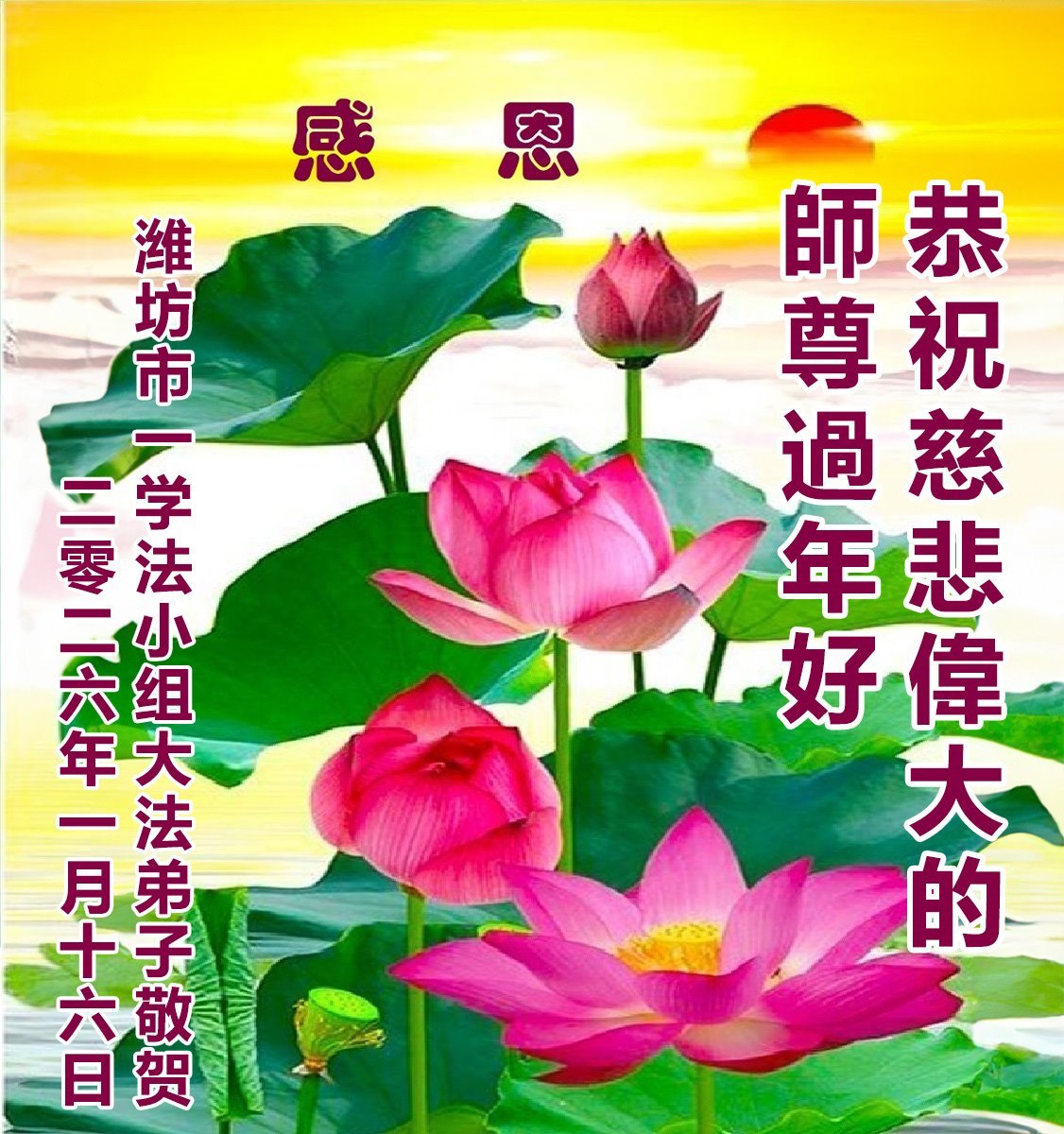 恭祝慈悲偉大的師父新年快樂!感恩師父慈悲救度!感恩師父不放棄,使弟子在法理中昇華,使身體健康,知道了怎樣做一個處處為別人著想的更好的人。在新的一年裏,弟子要多學法、學好法,做好三件事,跟師父回家!