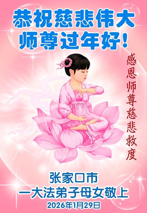 恭祝師尊過年好!感恩師尊的慈悲苦度!感恩師尊保護弟子家人。弟子用盡人類的語言也無法表達對您的感恩。在正法修煉最後,弟子一定走穩走正最後這段路,牢記您的教誨,對照法向內找,實修自己,救更多的有緣眾生,隨師返回自己真正的家園。弟子新年叩謝師恩!