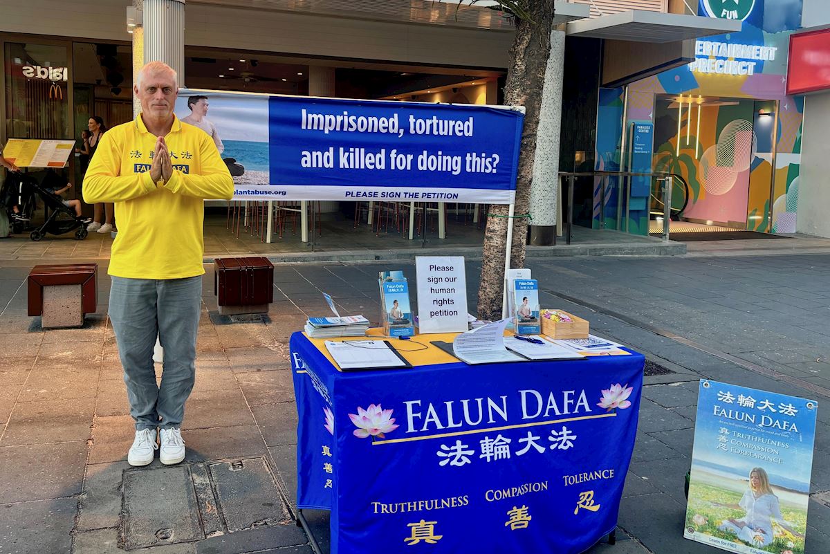 黃金海岸真相點是在旅遊勝地衝浪者的天堂,幾步之遙便是綿延的海岸線和海邊集市,還有步行街上的各種表演,吸引了當地和世界各地的遊客,人群湧動,熱鬧非凡。法輪功的展位非常醒目,有展示的橫幅、功法表演和徵簽,前來了解真相和簽名的眾生絡繹不絕。