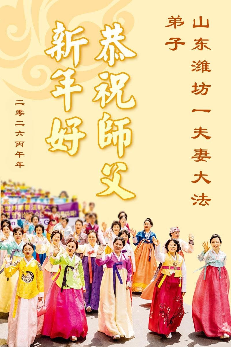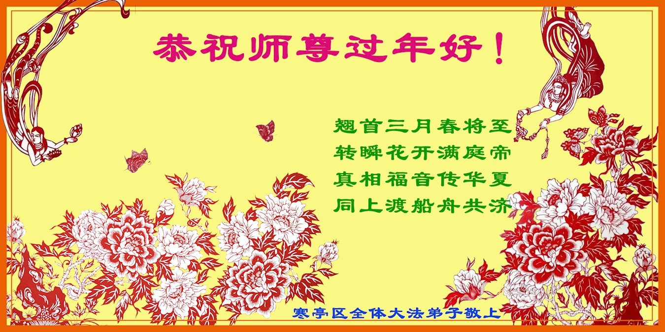 慈悲偉大的師父好!弟子給您拜年!我們是修煉二十八年多的老弟子。雖然我們離師父法中要求還相差很遠,但在魔難中能想起師父,遇到矛盾時刻想到自己是大法弟子,實實在在感受到了師父一直在身邊看護弟子,啟悟弟子。想起師父為救弟子、救眾生的一年又一年的無量承受,弟子常常淚流滿面,感恩不盡!我們只有精進實修,謹遵師父的慈悲教誨,做爭氣的大法弟子。叩謝師父!