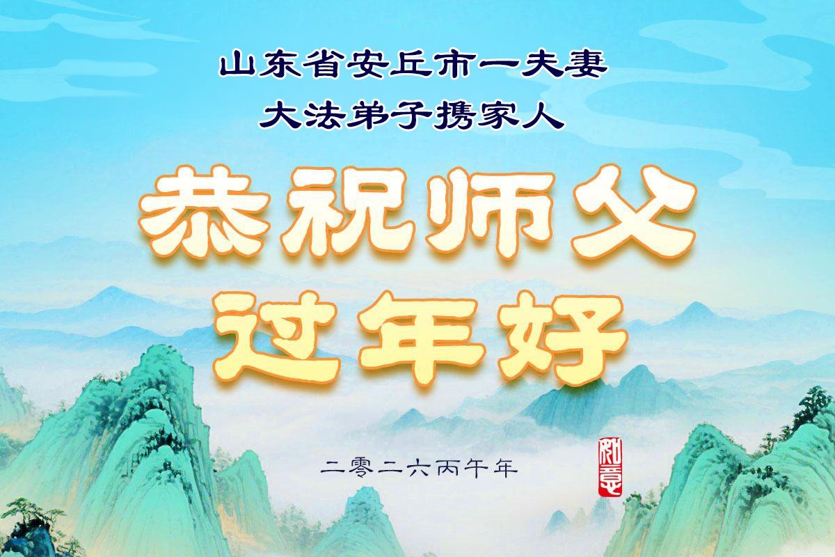 山東省濰坊市安丘市一夫妻大法弟子攜全體家人恭祝師尊新年快樂!