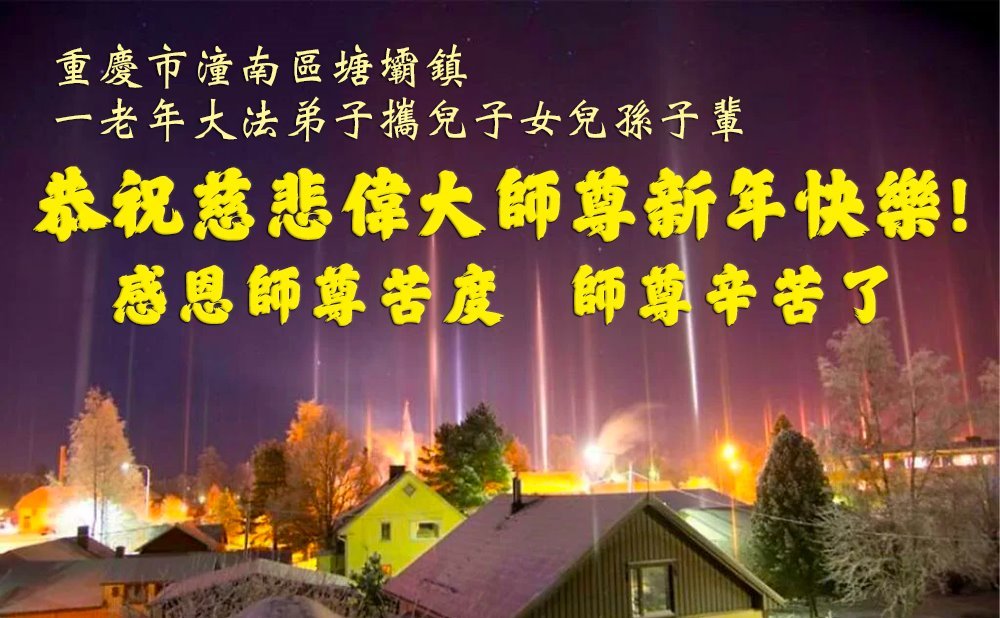 感恩師尊賜予我們偉大的宇宙大法,引領我們走上回歸之路。在師尊用巨大承受延續來的這段時間裏,我們一定努力精進,做好三件事。敬祝師尊新年快樂!
