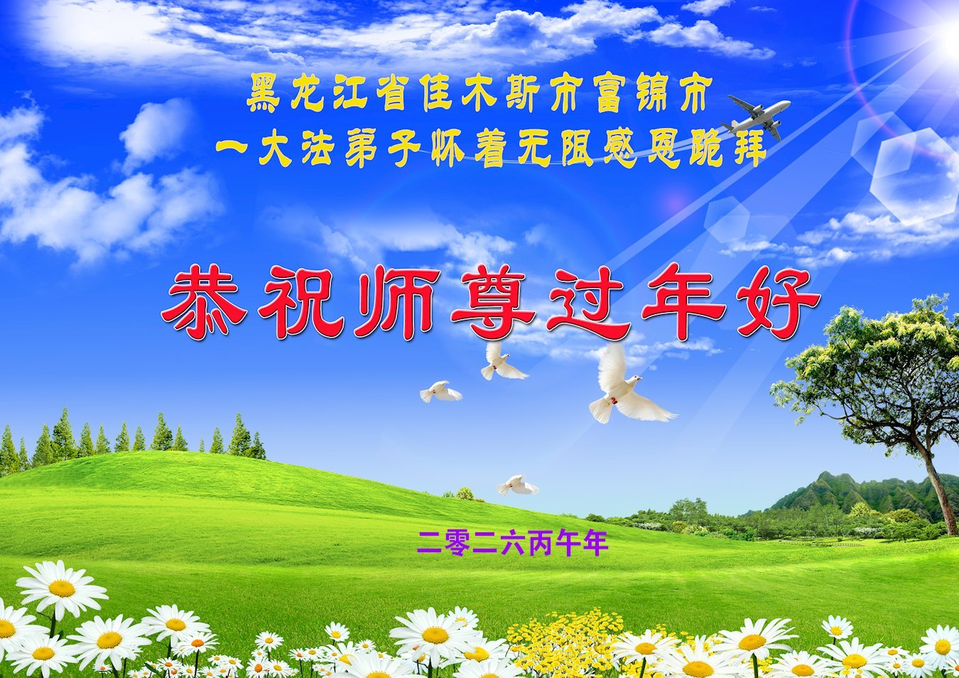 恭祝慈悲偉大的師父過年好!感謝師父對弟子的不離不棄!感謝師父給弟子安排的修煉環境,感謝師父對弟子的慈悲看護與點悟!弟子願新的一年裏,做好三件事,助師救度眾生中要正念不要人心,修好自己,救度更多有緣眾生。弟子叩謝師父!