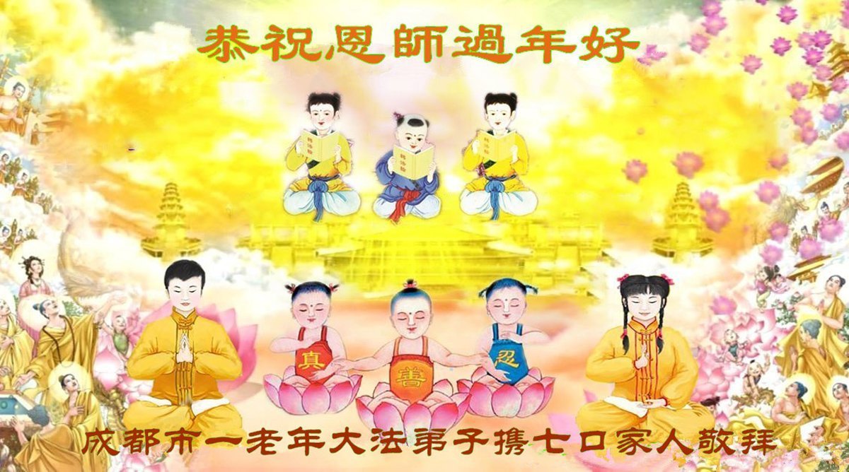 感恩師尊慈悲苦度!二十一年的修煉,離不開師父時刻的保護,懈怠時師父慈悲點化,精進時師父無量慈悲給予鼓勵。用盡人類的語言也難表對師父的感恩。唯有多救人,努力做好三件事來回報師恩,弟子攜全家給師尊拜年。