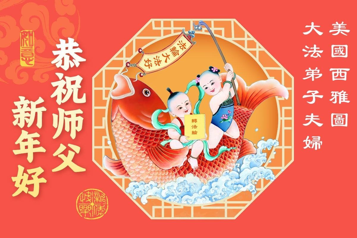 美國西雅圖大法弟子夫婦恭祝師尊新年好!