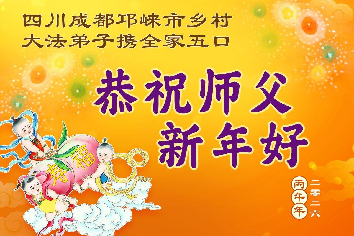 四川成都邛崍市鄉村大法弟子攜全家五口恭祝師尊過年好!