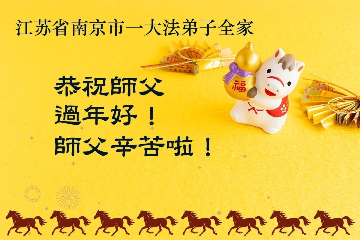 在這新年即將到來之際,我代表我家族的同修和在我家學法的所有同修,向師尊表達最誠摯問候,感恩師尊對弟子們的慈悲苦度、提攜點悟和巨大的承受!也代表我們全家人向師尊問好,感恩師尊的慈悲保護!其實,即使用盡人間的語言也表達不了我們對師尊的感恩之心!今天代表大家祝師尊新年快樂!早日回國!叩拜師尊!