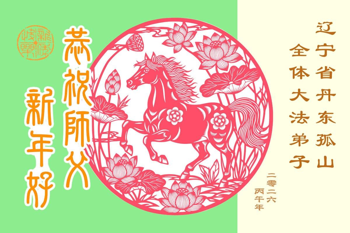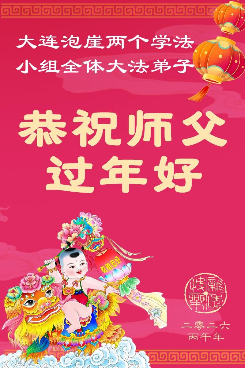 在新年即將來臨之際,大連市泡崖小區兩個學法小組全體十二名大法弟子,懷著無比感恩的心,給慈悲偉大的師父拜年!師父您辛苦了!弟子感恩師父慈悲救度!