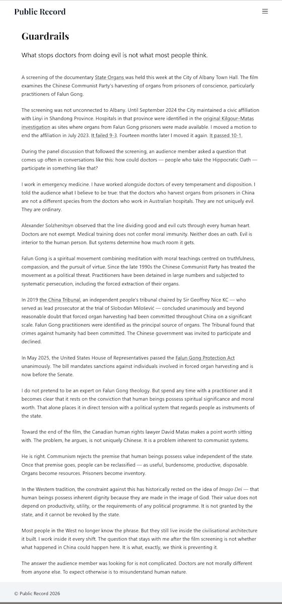 托馬斯‧布羅夫是一名急診科醫生,二零二一年當選為奧爾巴尼市議員。這是他第一次觀看這一影片,此前曾讀過大衛﹒麥塔斯(David Matas)的著作《血腥的活摘器官》(Bloody Harvest:The Killing of Falun Gong for Their Organs),對相關議題已有了解。他在影片結束當天撰寫了一篇題為《護欄》(Guardrails)的文章,發表在《公共記錄》(Public Record)上。全文連結:https://publicrecord.media/guardrails/