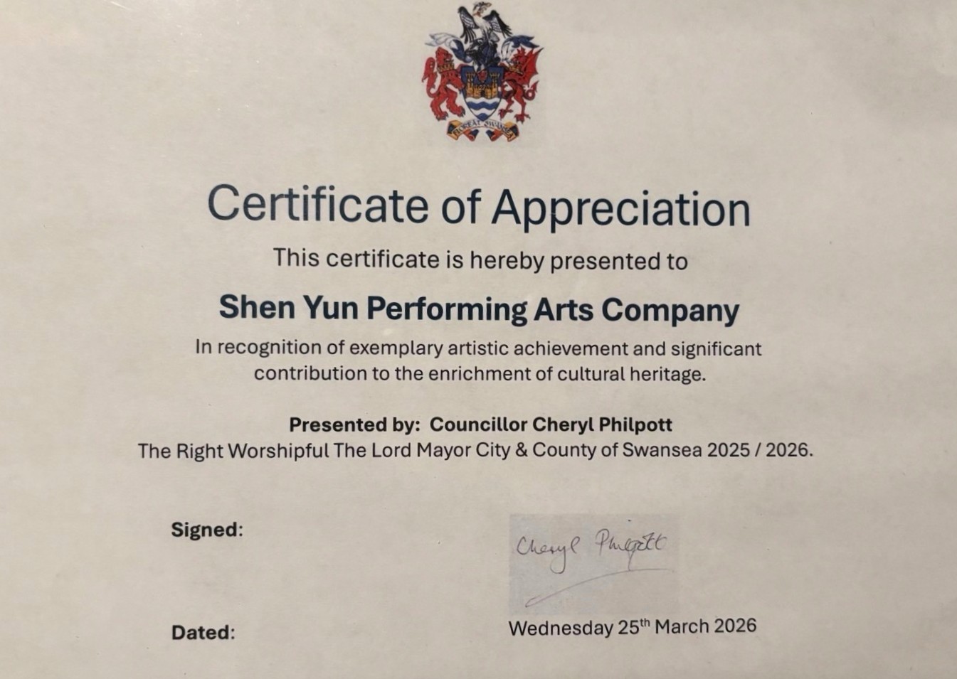 三月二十六日,神韻藝術團在英國斯旺西市的第四場演出圓滿落幕。三月二十五日晚,斯旺西市長菲爾波特(Cheryl Philpott)議員與丈夫觀看演出後,向神韻藝術家代表贈送了親筆簽名的感謝狀,以表彰其卓越的藝術成就和對弘揚豐富文化遺產所作出的重要貢獻。