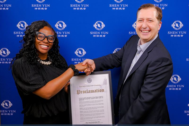 ![]() 圖2:二零二六年四月十二日下午,紐約市議會副議長那塔莎﹒威廉斯(Nantasha Williams)在林肯中心大衛﹒寇克劇院向神韻紐約藝術團頒發褒獎狀。(新唐人電視台) |