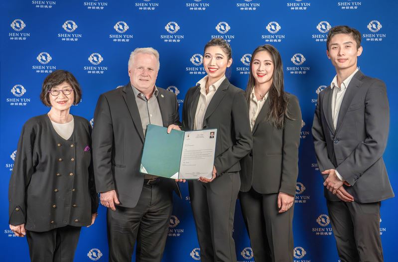 ![]() 圖3:二零二六年四月十日,溫哥華國會議員馬克﹒道爾頓(Marc Dalton)(左二)親臨劇院,向神韻主辦方頒發賀信,並與神韻演員合影。(大紀元) |