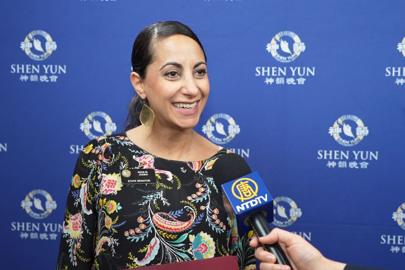 ![]() 圖5:二零二六年四月十二日下午,州參議員伊曼‧喬德(Iman Jodeh)親臨現場,代表科羅拉多州參議院向神韻頒發褒獎。(新唐人電視台) |