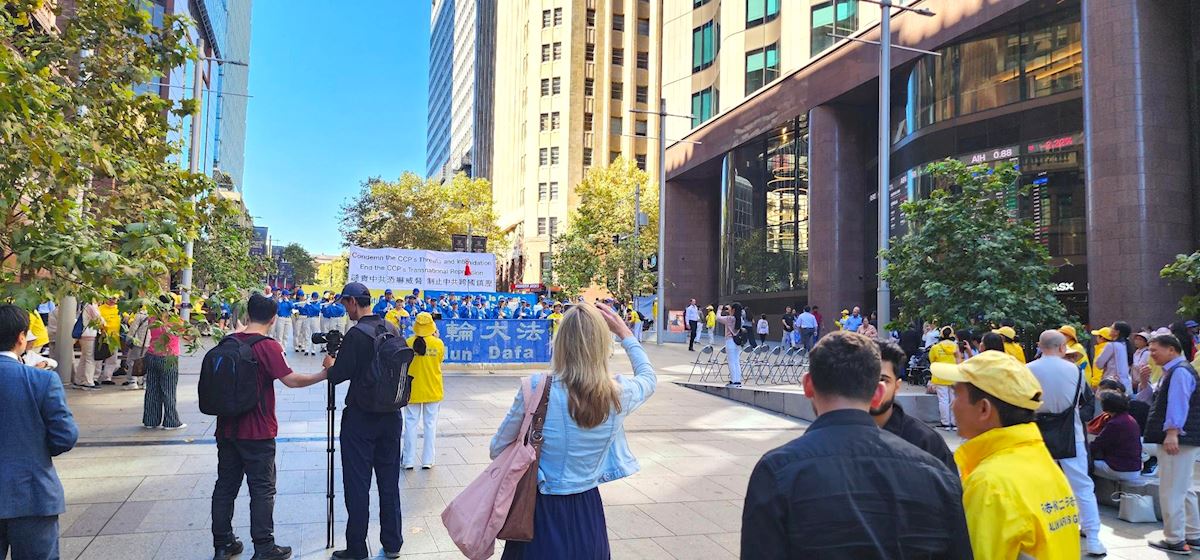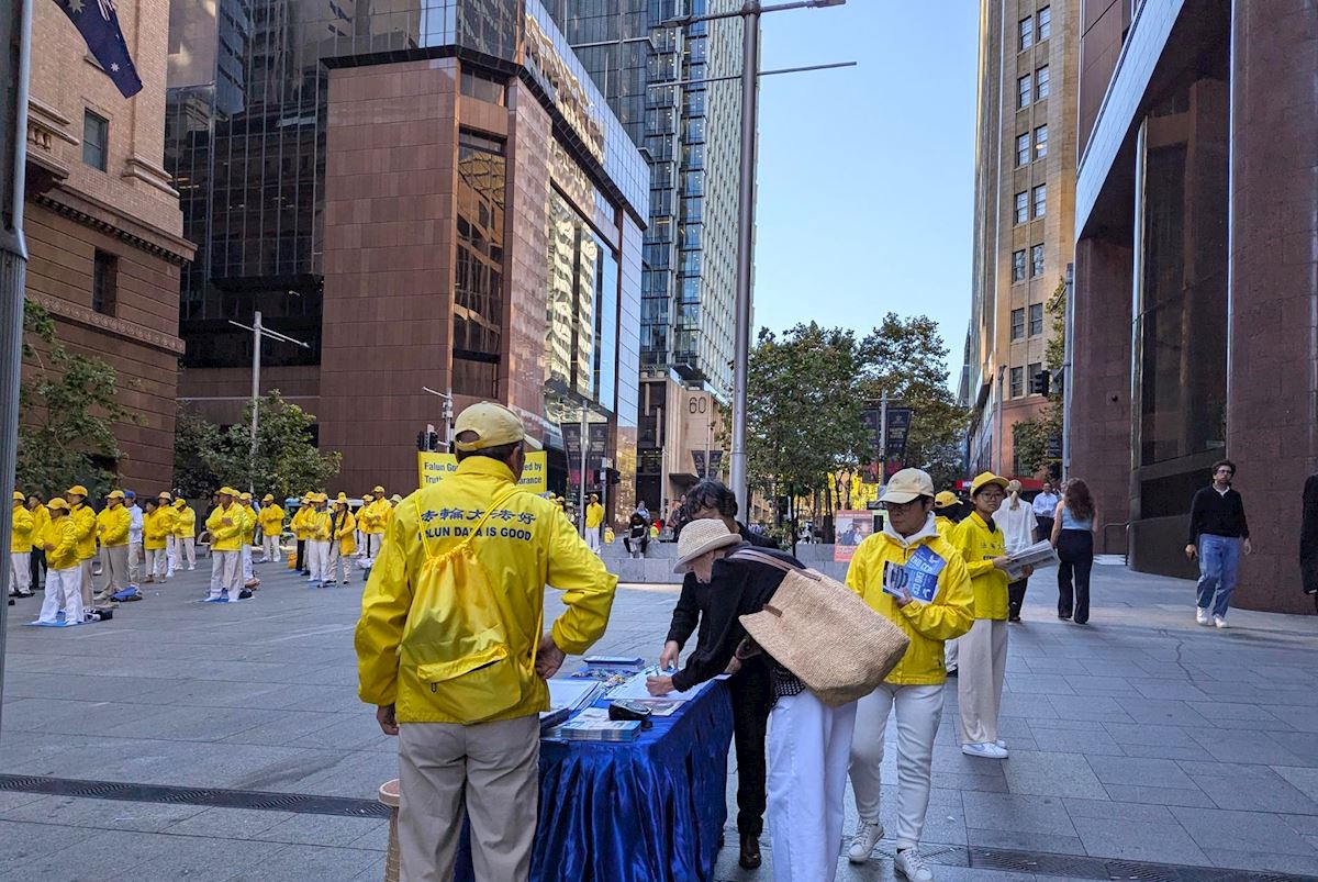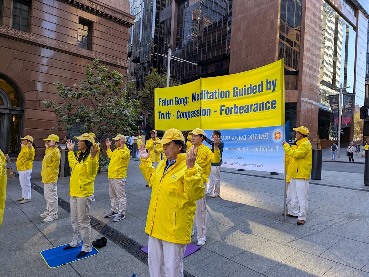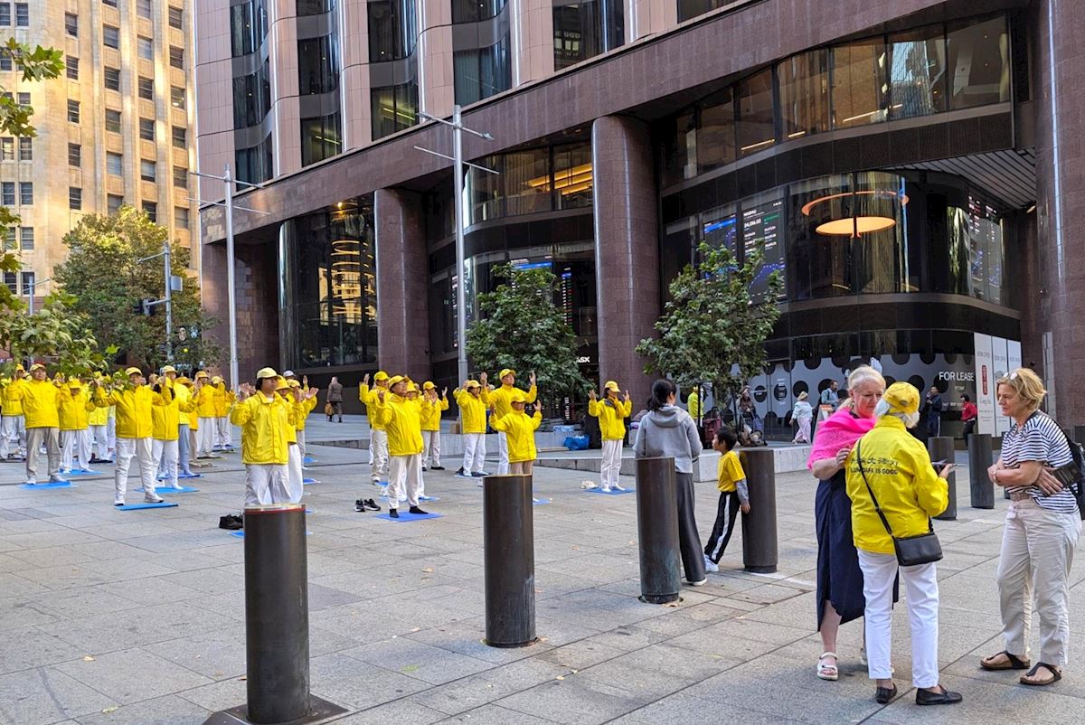 作為悉尼的「城市心臟」,馬丁廣場是位於悉尼市中心的步行街,來往行人絡繹不絕。在悠揚的煉功音樂中,法輪功學員在廣場上演示了五套功法,動作舒緩,場面宏大,氣氛祥和。很多路人駐足觀看、拍照。人們接過法輪功和神韻真相資料,或與法輪功學員交談,或在徵簽表上簽名支持法輪功學員反迫害。