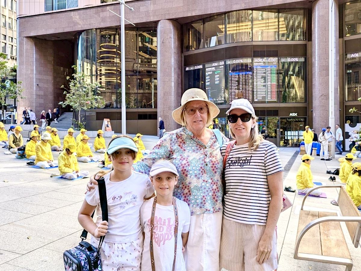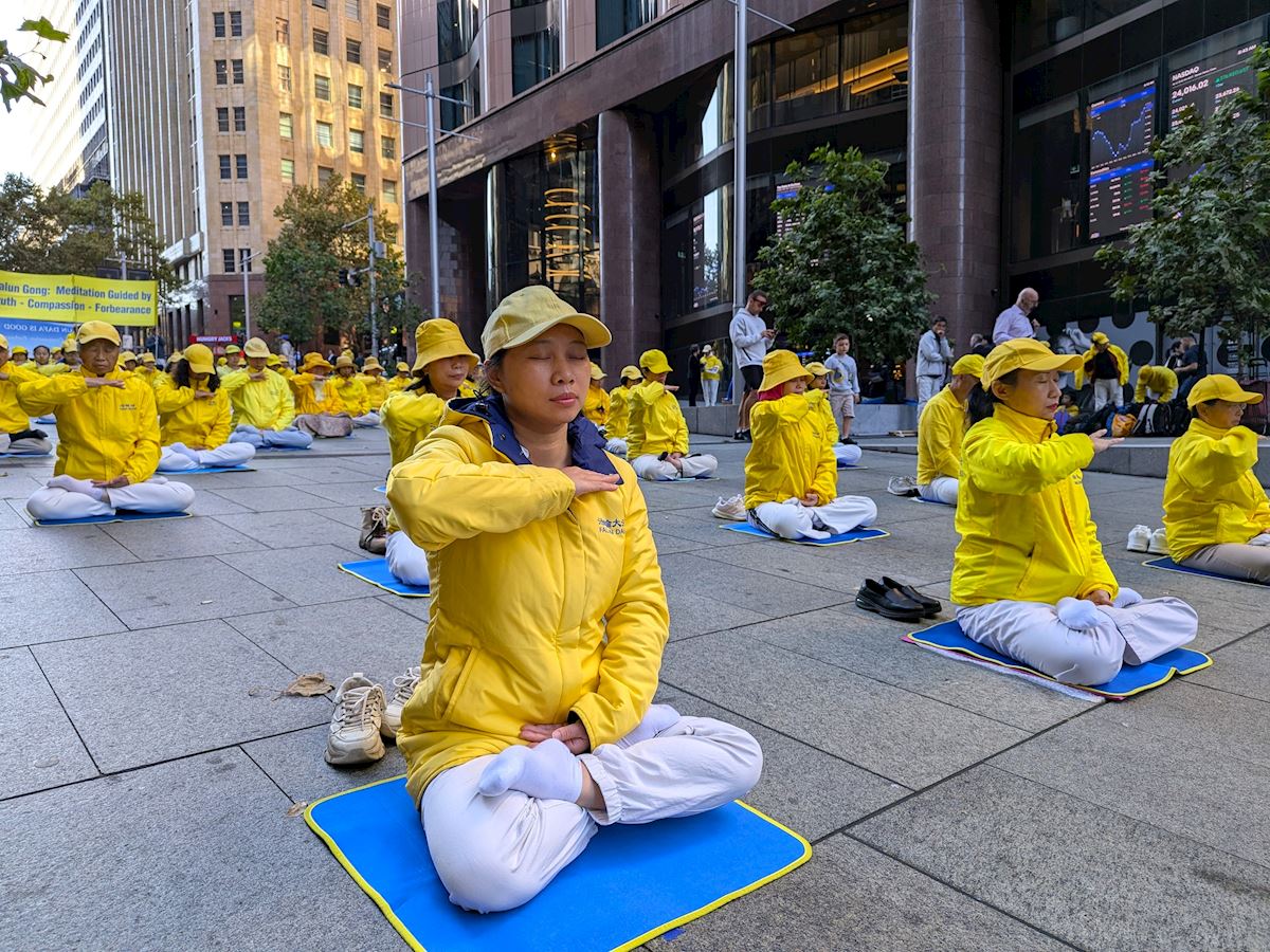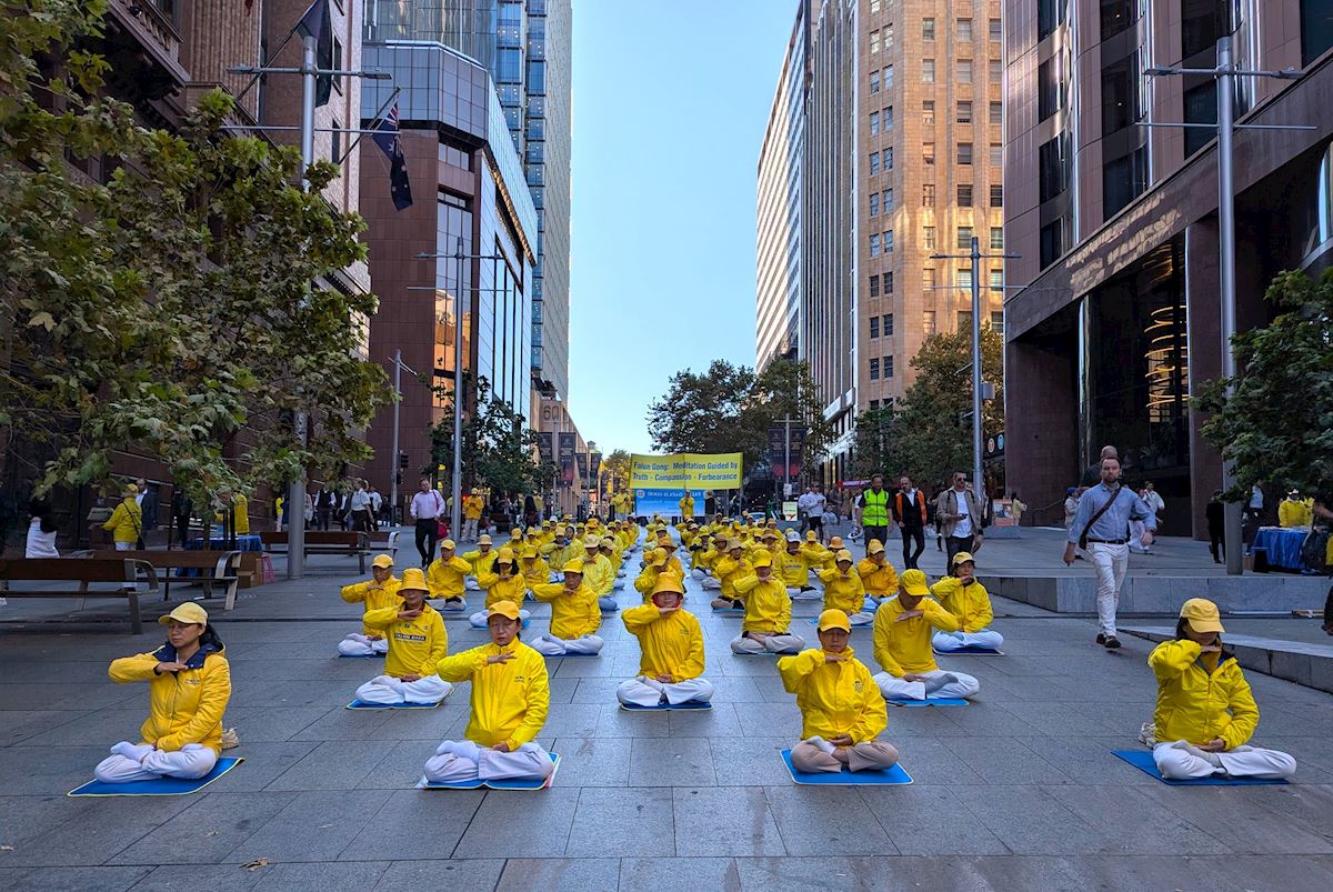 作為悉尼的「城市心臟」,馬丁廣場是位於悉尼市中心的步行街,來往行人絡繹不絕。在悠揚的煉功音樂中,法輪功學員在廣場上演示了五套功法,動作舒緩,場面宏大,氣氛祥和。很多路人駐足觀看、拍照。人們接過法輪功和神韻真相資料,或與法輪功學員交談,或在徵簽表上簽名支持法輪功學員反迫害。