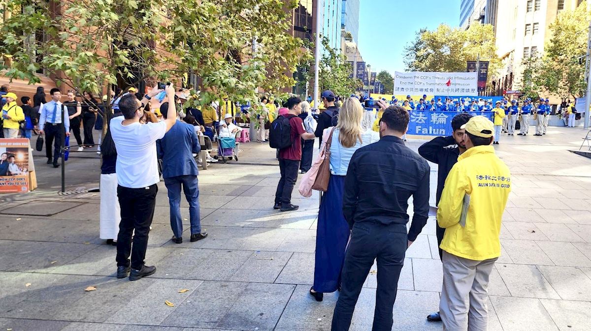 集體煉功之後,廣場上迴盪起莊嚴雄壯的樂音。在「譴責中共恐嚇威脅 制止中共跨國鎮壓」大型橫幅下,悉尼天國樂團的現場演奏,氣勢磅礡、震撼人心。人們紛紛舉起手機拍照錄像。