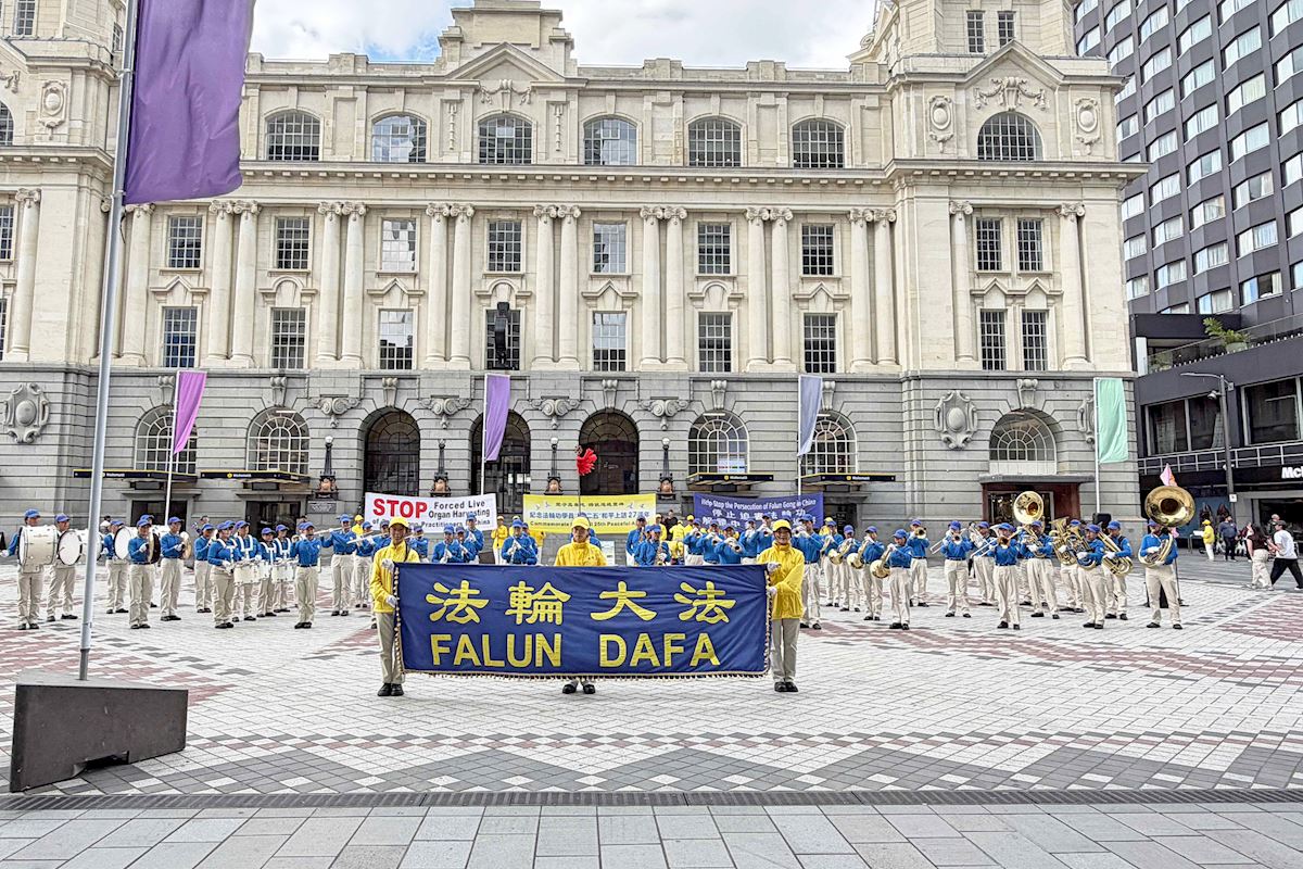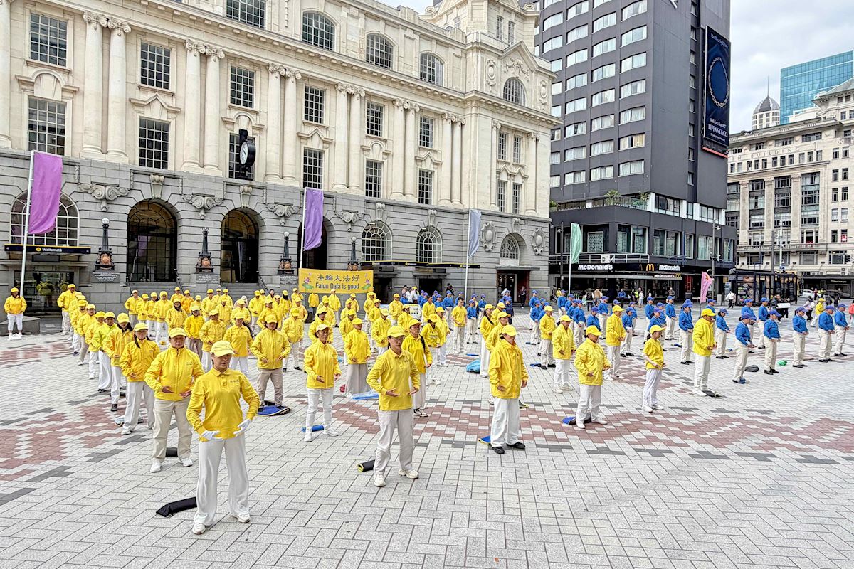 ![]() 圖1~2:二零二六年四月十八日新西蘭法輪功學員在奧克蘭市中心的商業灣廣場舉行集體煉功,紀念「四﹒二五」和平上訪。 |