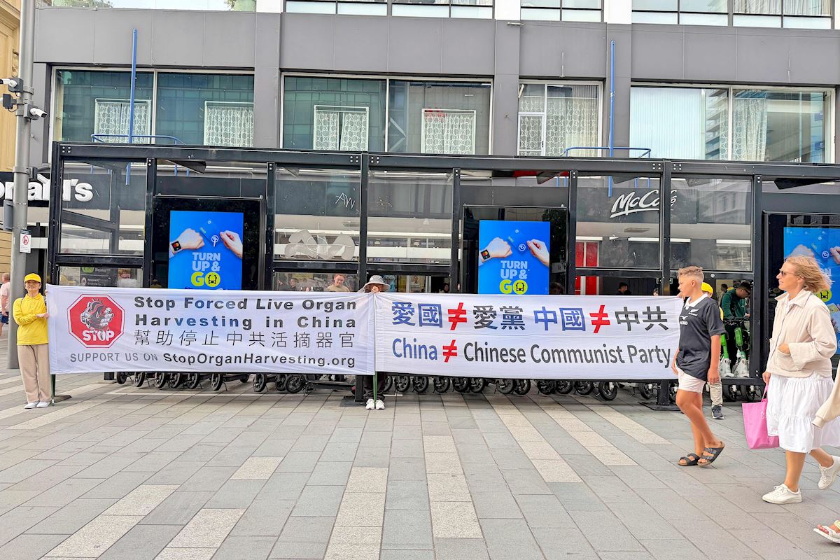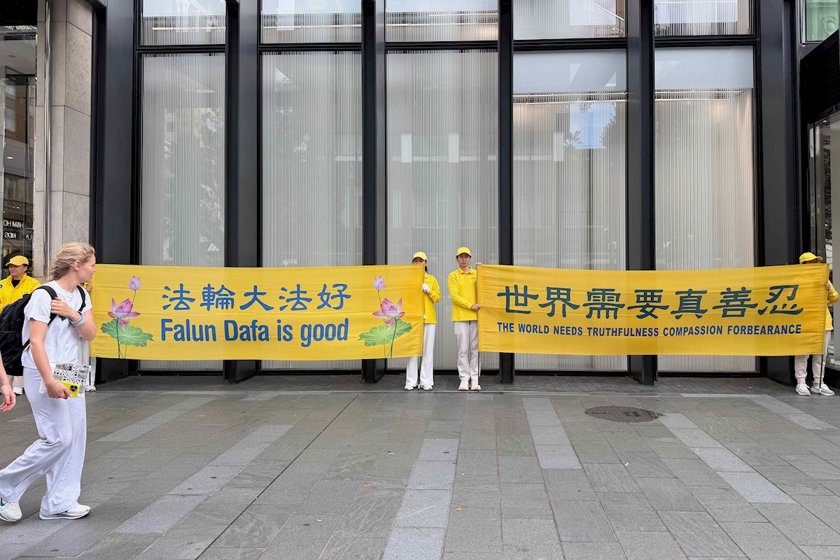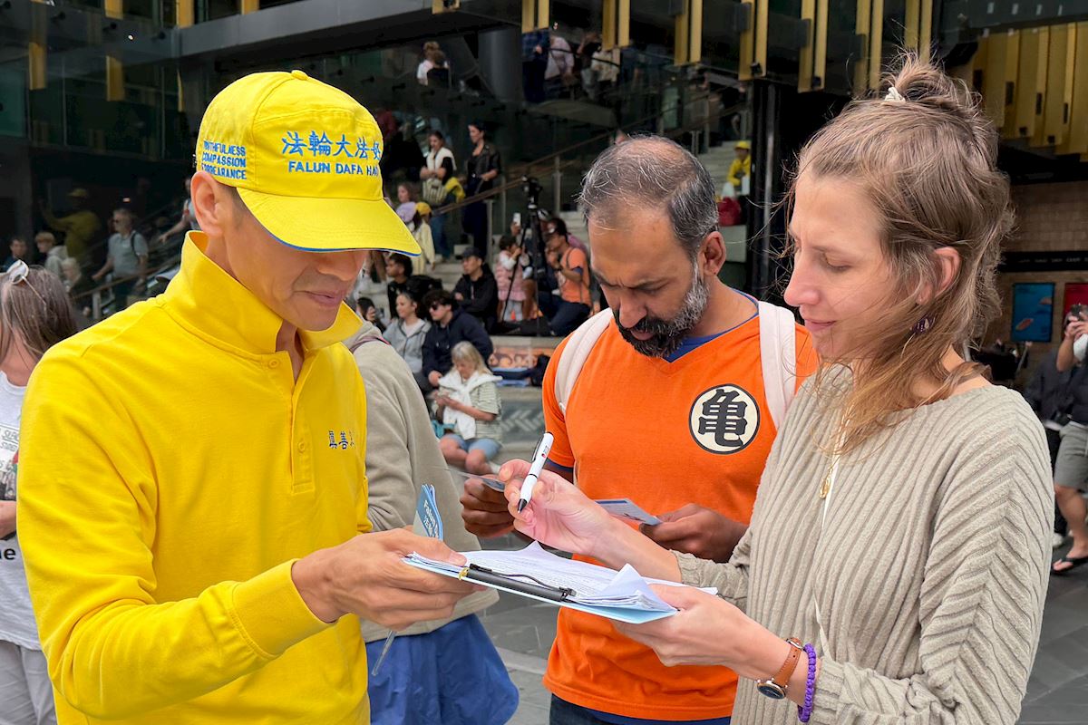 活動現場,學員們向過往行人講述了此後中共對法輪功群體持續二十多年的迫害,引發不少市民關注與思考。