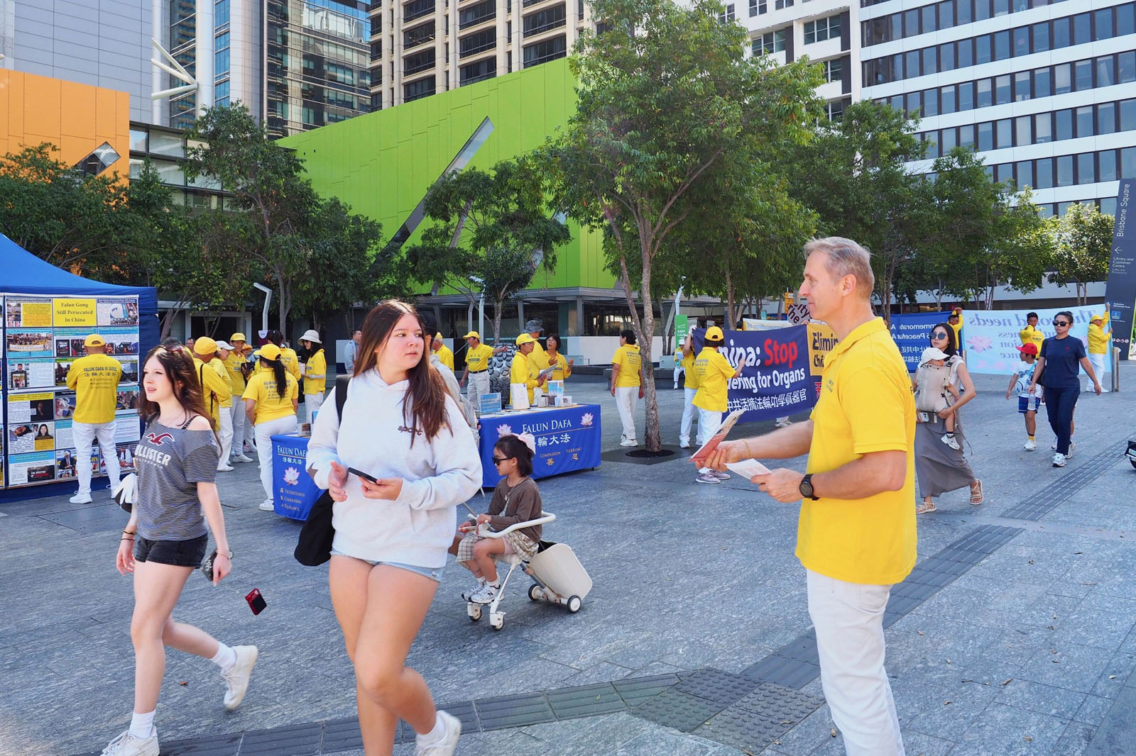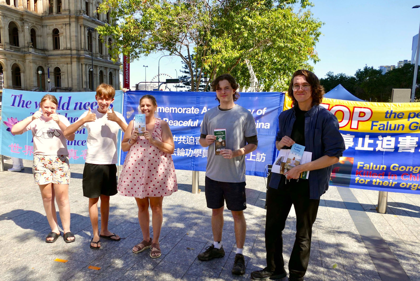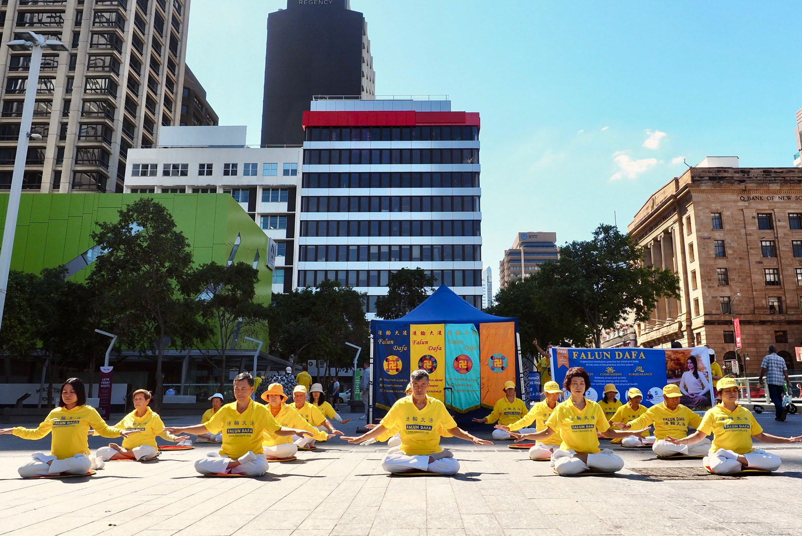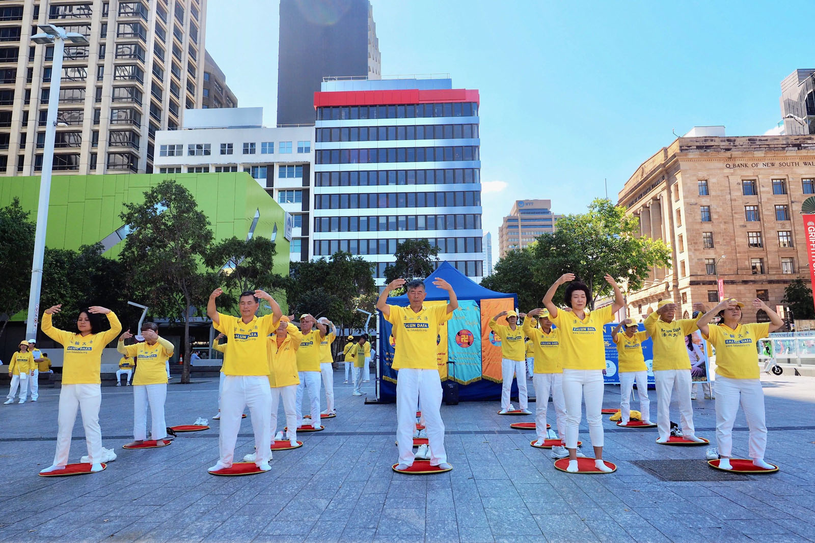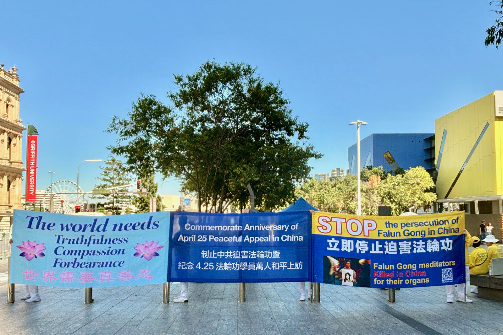 圖1~2:二零二六年四月十八日,澳洲昆士蘭法輪功學員在布里斯班廣場 舉行了集體煉功、橫幅展和講真相活動,紀念四﹒二五法輪功學員和平上訪二十七週年。