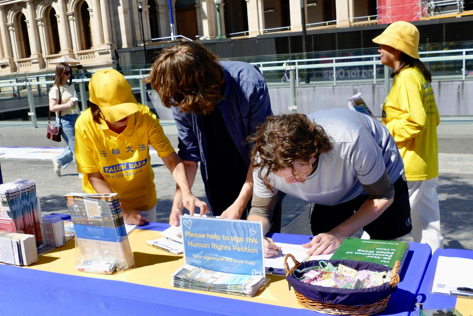 圖13:艾登﹒弗羅斯特(左一)和瑞利﹒埃文斯 (左二)現場簽名支持法輪功反迫害。