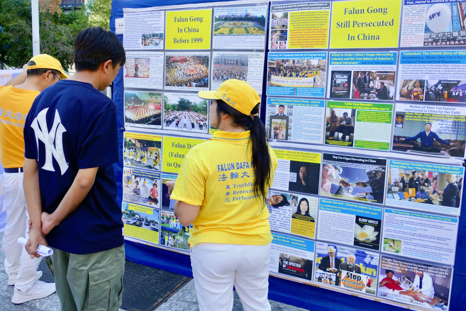 法輪功的真相活動震撼著過往的路人,一對華人夫婦停下腳步,觀看展板,並仔細聆聽真相。法輪功學員告訴他們,今天是紀念法輪功學員和平、理性上訪二十七週年,一萬多名法輪功學員上訪,以身心受益的切身經歷,反映法輪功於國於民有百利而無一害的真實情況。提出釋放被天津公安非法抓捕的法輪功學員;允許法輪功書籍合法出版;給修煉法輪功一個合法環境來修煉真善忍。法輪功學員堅持和平理性的反迫害,受到世人的稱讚。