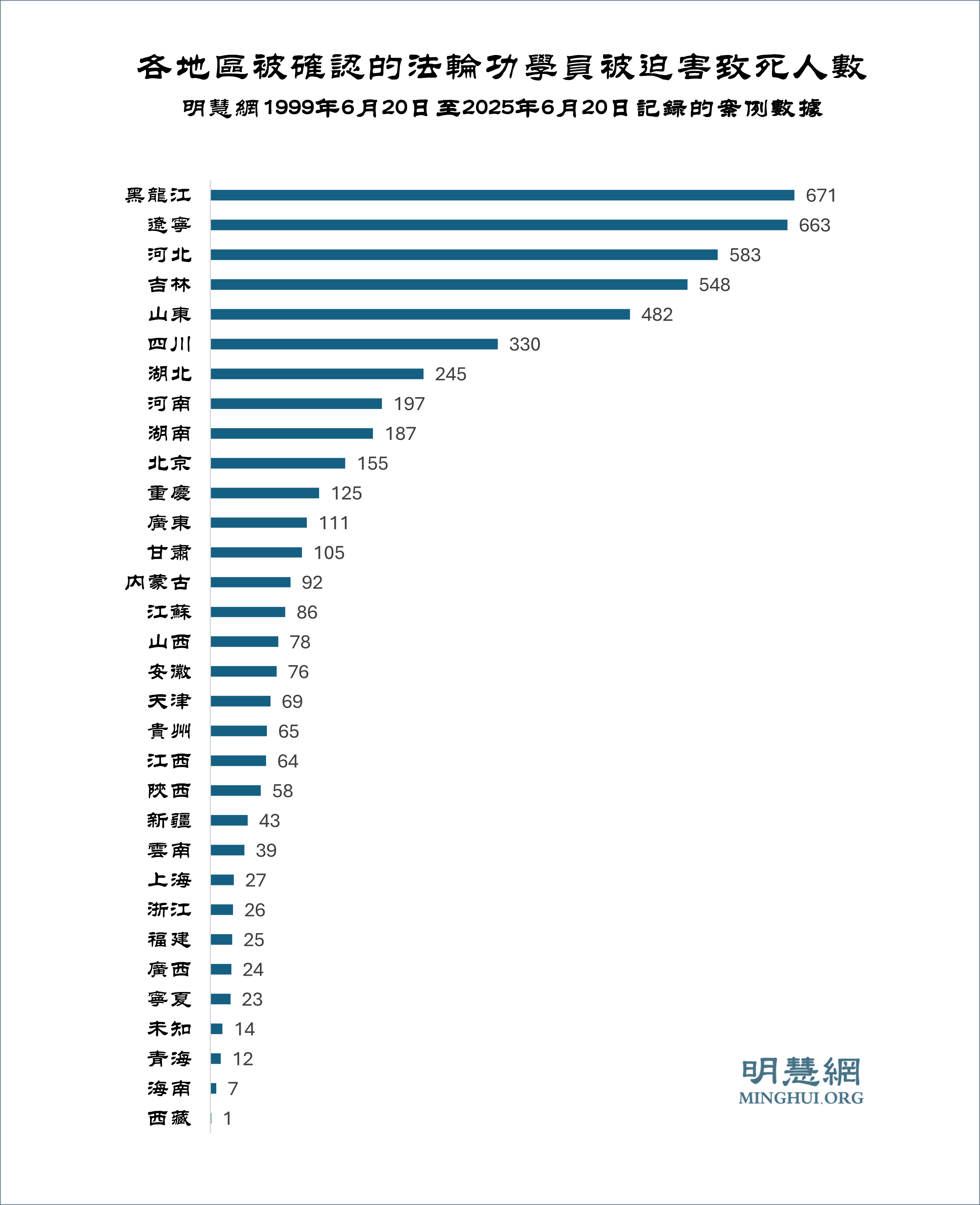 二、26年來中國大陸各地區已確認的被迫害致死法輪功學員人數(未報導出來的迫害致死案例、不是直接因暴力迫害而導致死亡的案例、因被剝奪修煉權利而舊病復發致死的案例沒有計入在內):