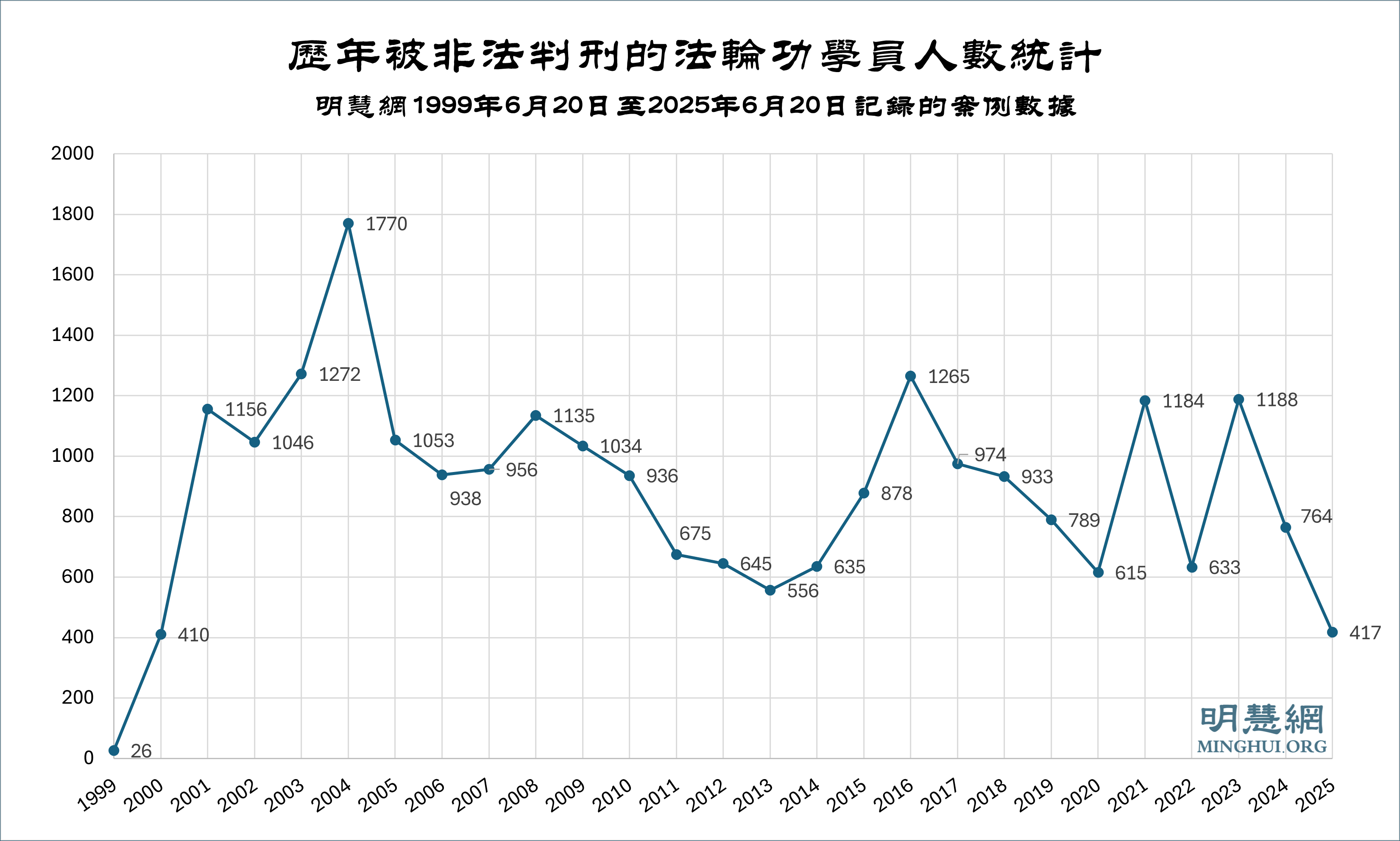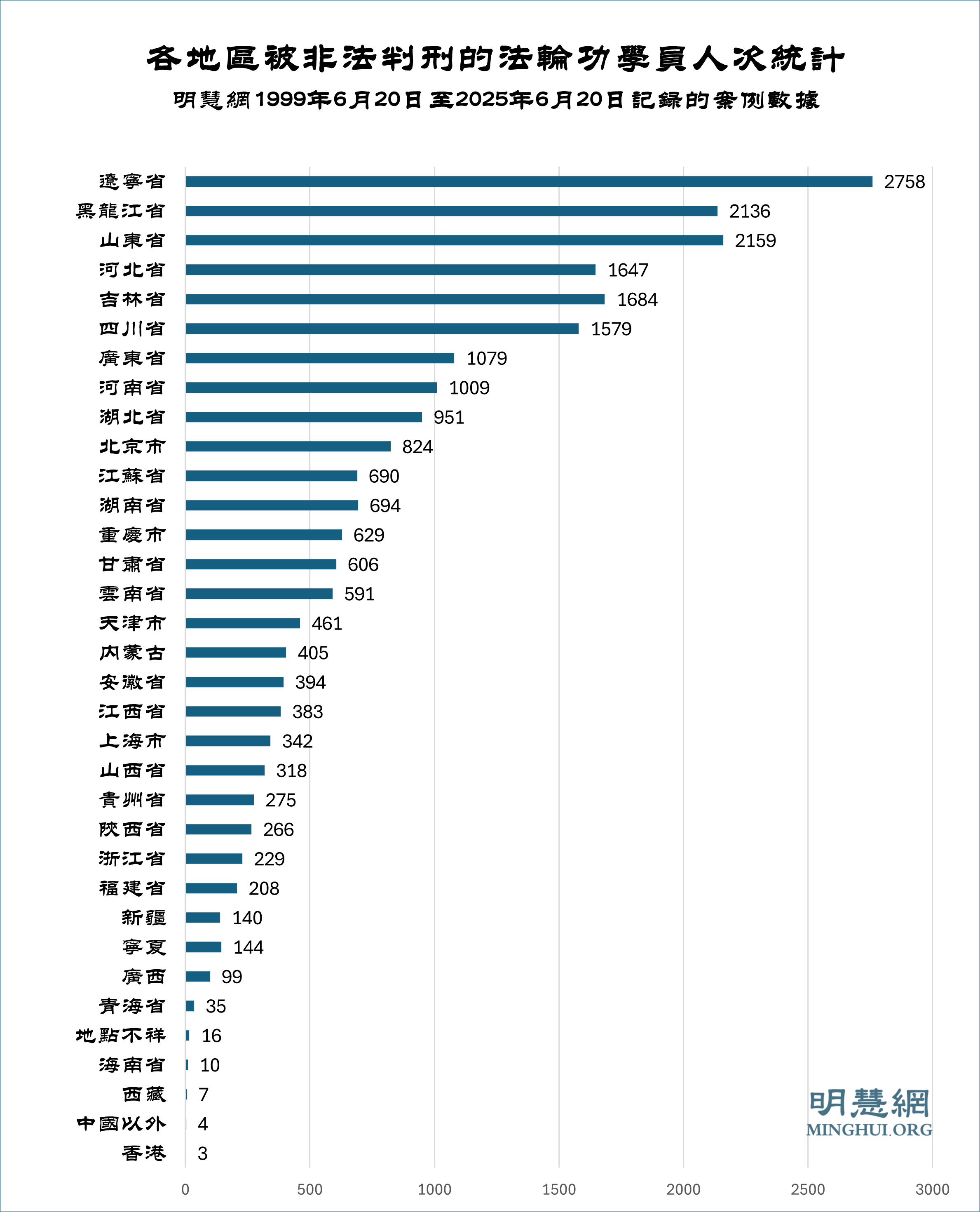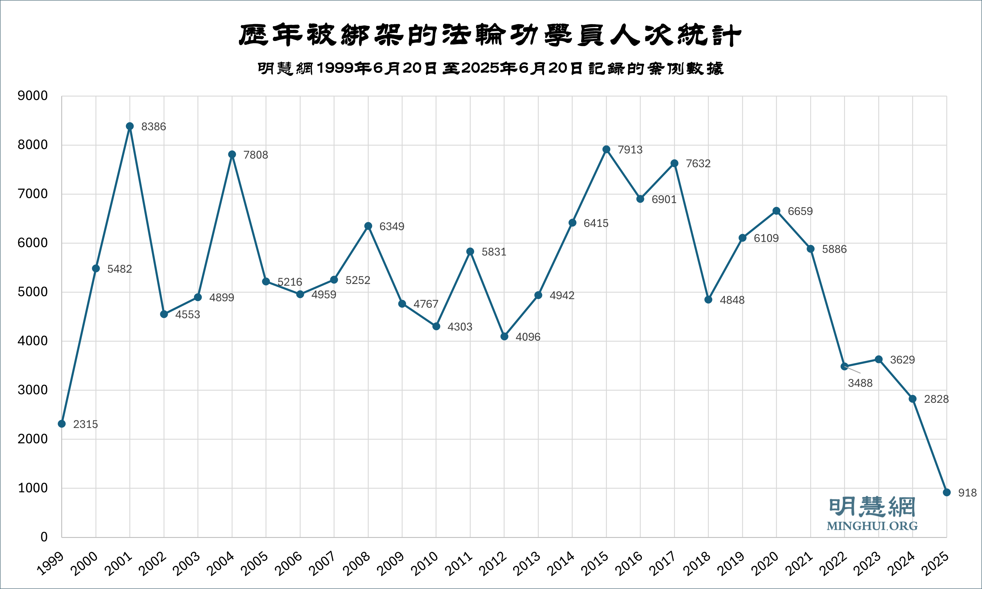 本文為大家提供的,是從一九九九年明慧網有數據以來至二零二五年六月二十日的一組迫害案例統計圖表。以小見大,這組圖表既反映了中共迫害法輪功的情況,也反映了當地大法弟子的報導能力,以及全體大法弟子二十六年來前仆後繼、堅韌反迫害的成果。圖三、五、七、九清晰地反映出迫害趨於結束的走向。