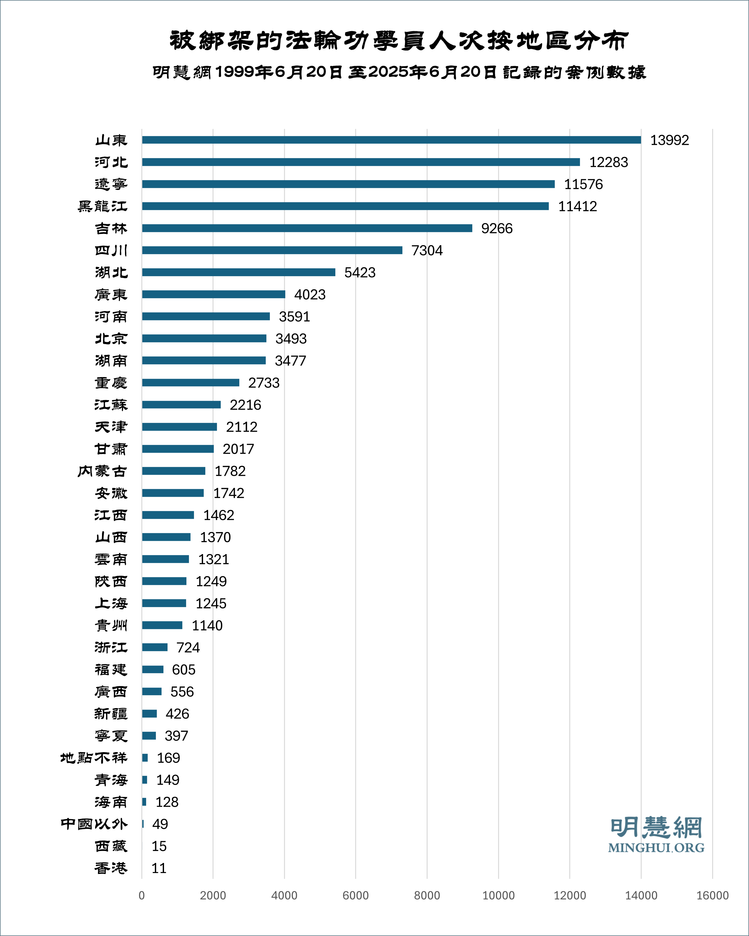 本文圖表中2017年至2025年的數據皆來自於明慧統計報告,其中2017年至2023年的數據與《明慧網25年報告》有差異。這可能是造成按年分布人數和按地區分布的人數統計不能自洽的原因。