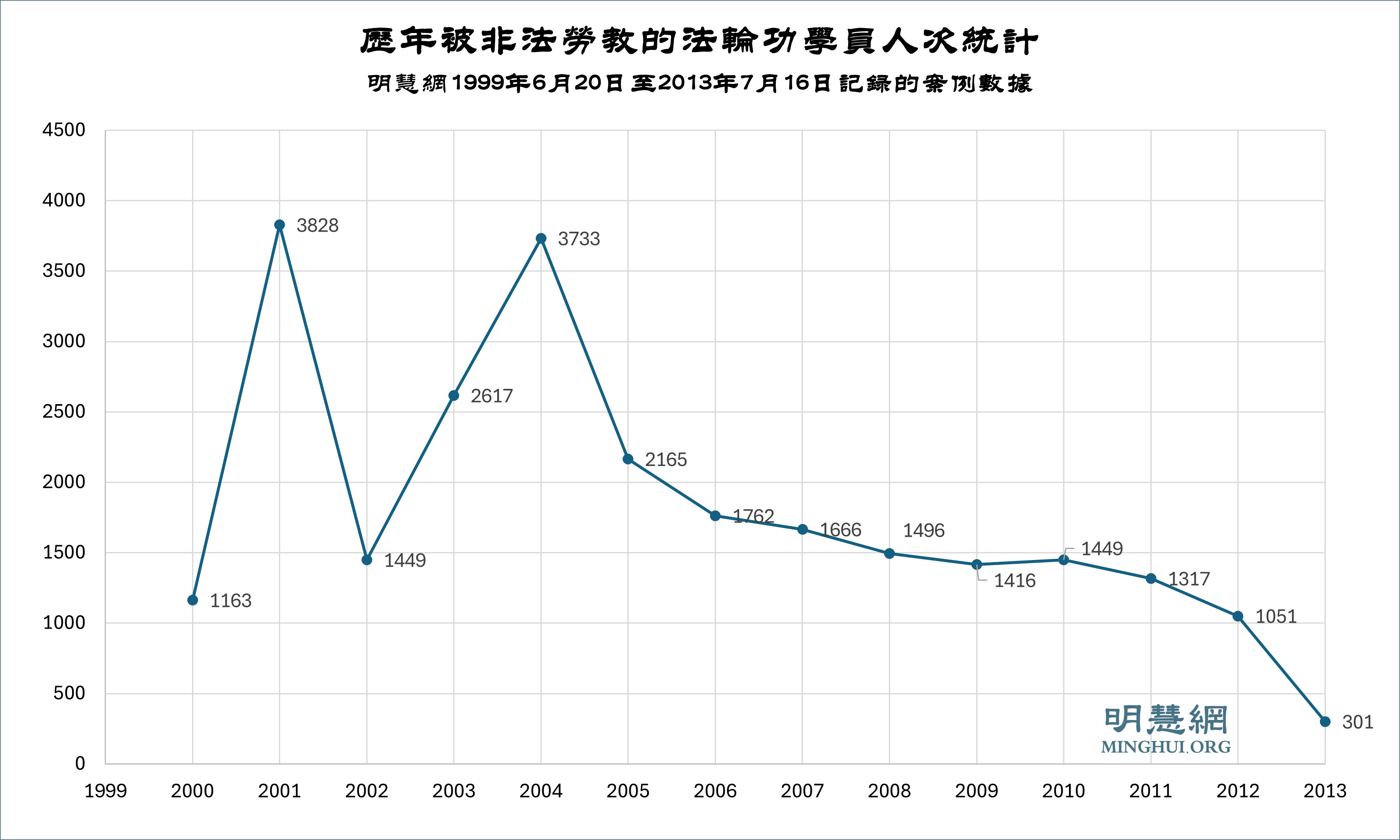 七、26年被非法勞教的法輪功學員人次統計(中共從蘇聯引進的、各地中共人員最廣泛用以迫害法輪功的勞教制度已於2013年正式解體,故而此圖表的年份到2013年截止。未報導出來的案例沒有計入在內):